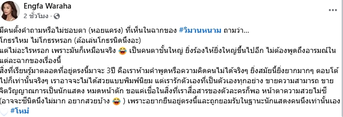 “เราอาจจะไม่ได้สวยแบบพิมพ์นิยม แต่เรารักตัวเองที่เป็นตัวเองทุกอย่าง ขายความสามารถ ขายจิตวิญญาณการเป็นนักแสดง หมดหน้าตัก ขอแค่เชื่อในสิ่งที่เราสื่อสารของตัวละครก็พอ หน้าตาความสวยไม่ซี (อาจจะซีนิดนึงไม่มาก อยากสวยบ้าง) เพราะอยากยืนอยู่ตรงนี้และถูกยอมรับในฐานะนักแสดงคนนึงเท่านั้นเอง #โหม๋”