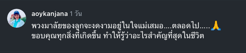 โดยล่าสุด คุณแม่อ้อย กาญจนา แม่ของนางเอกสาว มิน พีชญา ได้โพสต์ภาพพวงมาลัยจากลูกสาว พร้อมข้อความว่า “พวงมาลัยของลูกจะงดงามอยู่ในใจแม่เสมอ….ตลอดไป….. ขอบคุณทุกสิ่งที่เกิดขึ้น ทำให้รู้ว่าอะไรสำคัญที่สุดในชีวิต” ท่ามกลางคอมเม้นต์รูปหัวใจรัวๆ