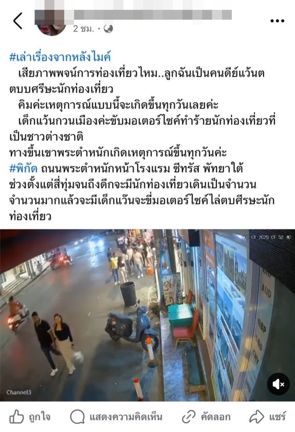 วันที่ 15 ม.ค.68 ผู้สื่อข่าวรายงานว่า เพจอยากดังเดี๋ยวจัดให้ รีเทริน์ Part6 ได้โพสต์ข้อความ #เล่าเรื่องจากหลังไมค์ เสียภาพพจน์การท่องเที่ยวไหม..ลูกฉันเป็นคนดีย์แว้นตบศรีษะนักท่องเที่ยว เหตุการณ์แบบนี้จะเกิดขึ้นทุกวันเลยค่ะ เด็กแว้น กวนเมืองค่ะขับมอเตอร์ไซค์ทำร้ายนักท่องเที่ยวที่เป็นชาวต่างชาติ ทางขึ้นเขาพระตำหนักเกิดเหตุการณ์ขึ้นทุกวันค่ะ #พิกัด ถนนพระตำหนักหน้าโรงแรม ซีทรัส พัทยาใต้ ช่วงตั้งแต่สี่ทุ่มจนถึงดึกจะมีนักท่องเที่ยวเดินเป็นจำนวนจำนวนมากแล้วจะมีเด็กแว๊นจะขี่มอเตอร์ไซค์ไล่ตบศีรษะนักท่องเที่ยว