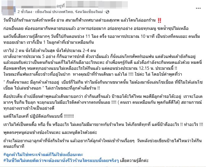 เราไม่ได้เป็นคนดื้อ หรือรั้น หรืออะไร ไม่เคยไม่มีมารยาทกับร้านไหน ให้เกียรติทุกที่ แต่นี่ป้าคืออะไร!! ทำอะไร!!! พูดตรงๆ หนูค่อนข้างข้องใจนะคะ และหนูติดใจด้วยค่ะ ถ้าจะไม่อยากเอาลูกค้าที่นั่งกินในร้าน แล้วอยากได้ลูกค้าใหม่เข้าร้านเรื่อยๆ วันหลังช่วยเขียนป้ายได้ไหมว่าให้กินคนละกี่นาที #ลูกค้าไม่ใช่พระเจ้าแต่ก็ไม่ใช่เหยื่อนะคะ #ในชีวิตไม่เคยคิดว่าจะต้องมานั่งรีวิวร้านใครแบบนี้เลยจริงๆ เสียความรู้สึกค่ะ