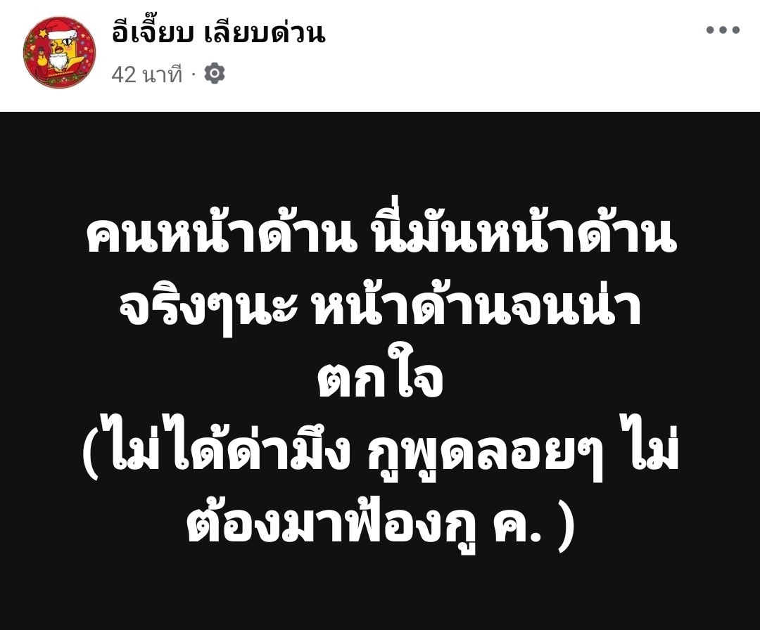 จากนั้นทางด้านเพจดังอย่าง อีเจี๊ยบ เลียบด่วน ก็ได้โพสต์ข้อความตามมา ซึ่งมีเนื้อหาในทำนองคล้ายๆ กัน ว่า “คนหน้าด้าน นี่มันหน้าด้านจริงๆนะ หน้าด้านจนน่าตกใจ (ไม่ได้ด่ามึง กูพูดลอยๆ ไม่ต้องมาฟ้องกู ค. )”