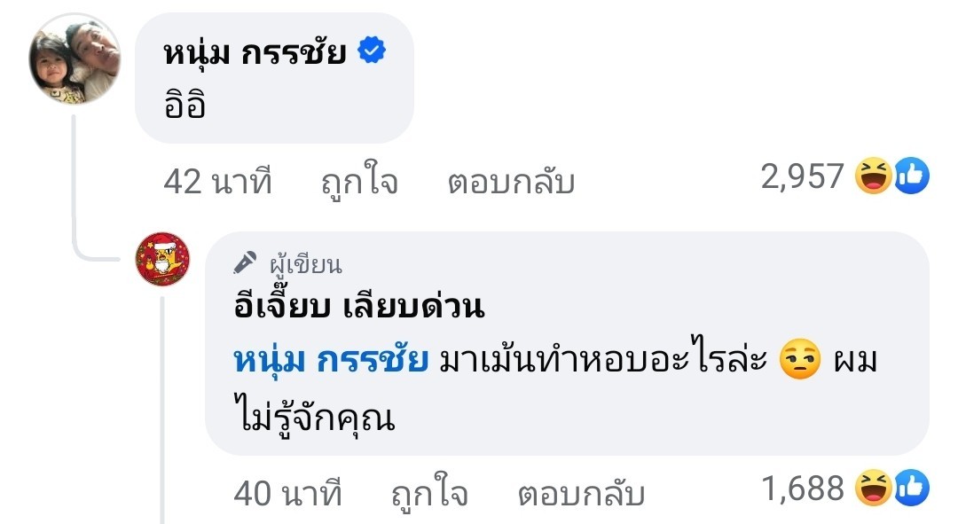 ต่อมา หนุ่ม กรรชัย ก็รีบเข้ามาคอมเมนต์แบบสั้นๆ ในทันที “อิอิ” ซึ่ง อีเจี๊ยบ เลียบด่วน ก็ได้ตอบกลับอย่างสนิทสนมว่า “มาเมนต์ทำหอบอะไรล่ะ ผมไม่รู้จักคุณ”