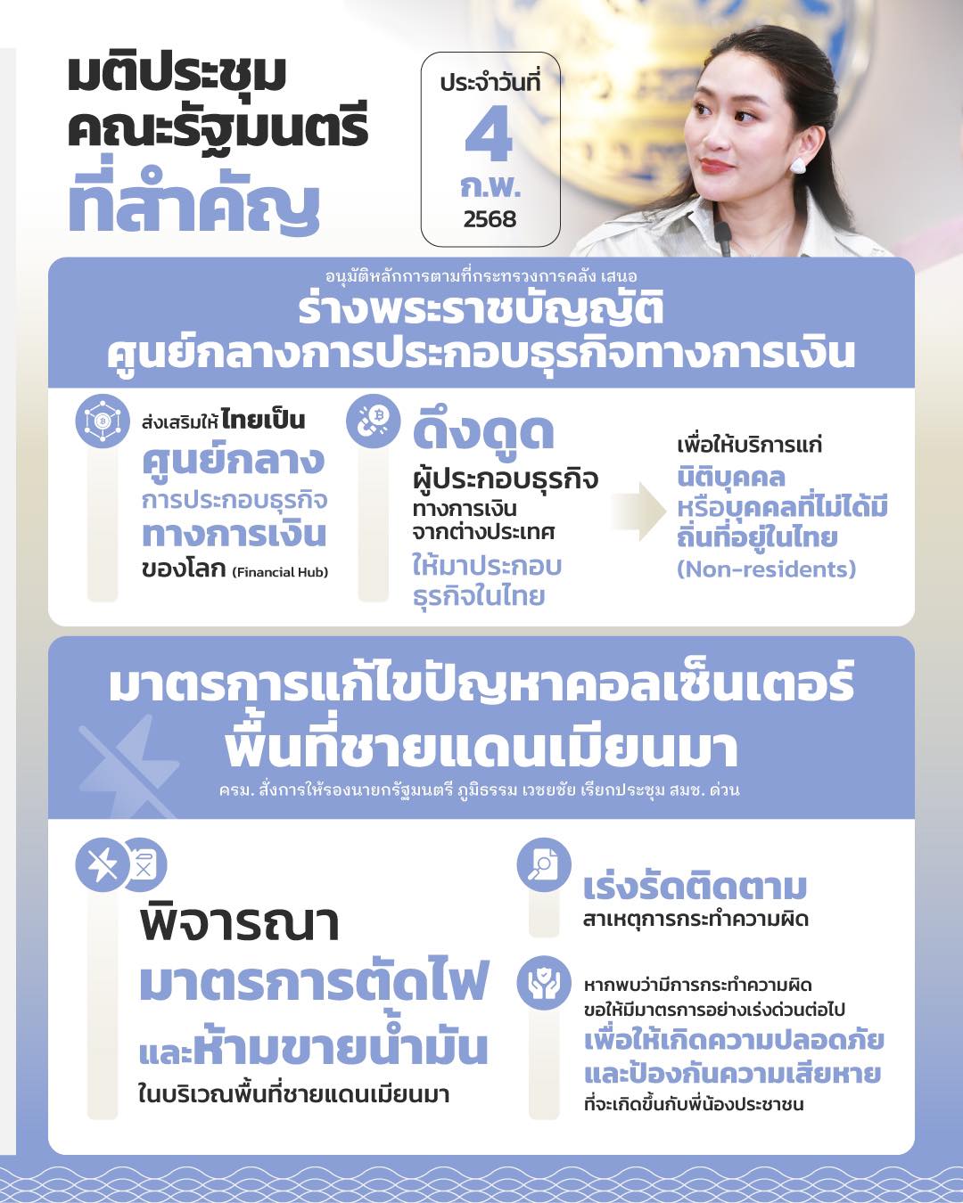 เมื่อถามถึงจุดยืนของรัฐบาลเรื่องการตัดไฟไปยังเมียนมา น.ส.แพทองธาร กล่าวว่า ที่จริงเรื่องนี้ไม่มีความลังเลอะไร และตนได้พูดในที่ประชุม ครม.โดยไม่มีความลังเล ถ้าเราดูเรื่องชายแดนชัดเจนก็ตัดได้เลย และเรื่องน้ำมันก็ไม่ต้องส่ง เราต้องโอบอุ้มและดูแลคนของเราก่อน เพราะสิ่งที่เกิดขึ้นมีผลกระทบต่อคนไทยมากและมีผลต่อภาพลักษณ์ของประเทศ