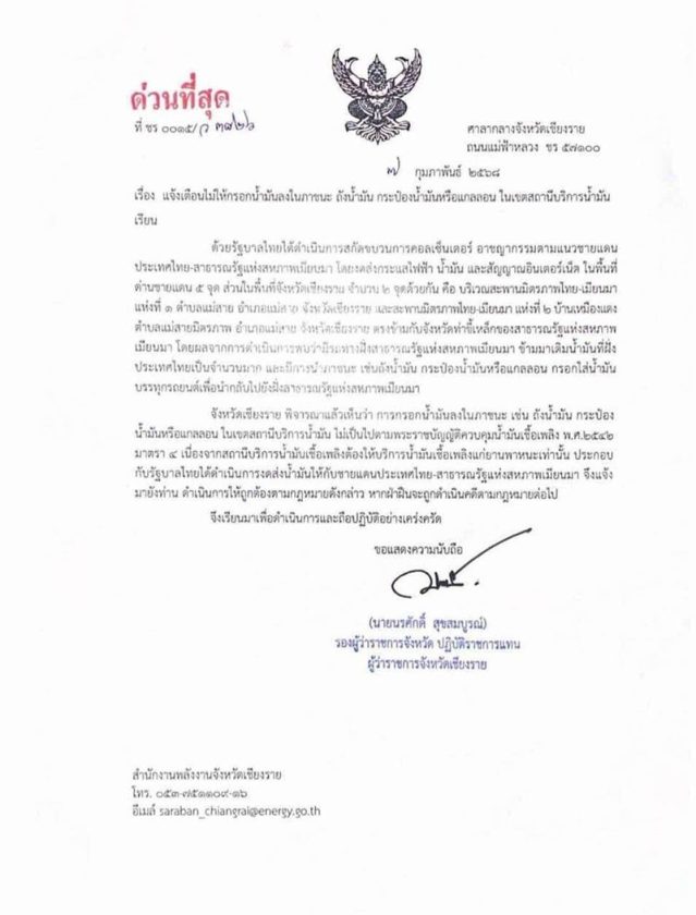 มาตรการตัดไฟ งดขายน้ำมันเชื้อเพลิงให้กับพื้นที่ 5 จุด ในประเทศเมียนมา ซึ่งเป็นพื้นที่ตั้งของแก๊งคอลเซนเตอร์ ส่งผลให้มีการนำรถยนต์ข้ามฝั่งมาเติมน้ำมันจากฝั่งไทยกลับไปยังประเทศเมียนมา วานนี้ (7 ก.พ.68) จังหวัดเชียงราย ออกหนังสือด่วนที่สุด เรื่อง แจ้งเตือนไม่ให้กรอกน้ำมันลงในภาชนะ ถังน้ำมัน กระป๋องน้ำมัน หรือแกลลอน ในเขตสถานีบริการน้ำมัน โดยระบุว่า รัฐบาลไทยได้ดำเนินการสกัดขบวนการคอลเซนเตอร์ อาชญากรรมตามแนวชายแดนประเทศไทย-สาธารณรัฐแห่งสหภาพเมียนมา โดยงดส่งกระแสไฟฟ้า น้ำมัน และสัญญาณอินเทอร์เน็ต ในพื้นพื้นที่ด่านชายแดน 5 จุด ส่วนในพื้นที่จังหวัดเชียงราย จำนวน 2 จุดด้วยกัน คือ บริเวณสะพานมิตรภาพไทย-เมียนมา แห่งที่ 1 ตำบลแม่สาย อำเภอแม่สาย และสะพานมิตรภาพไทย-เมียนมา แห่งที่ 2 บ้านเหมืองแดง ตำบลแม่สาย อำเภอแม่สาย ตรงข้ามกับจังหวัดท่าขี้เหล็ก ของสาธารณรัฐแห่งสหภาพเมียนมา
