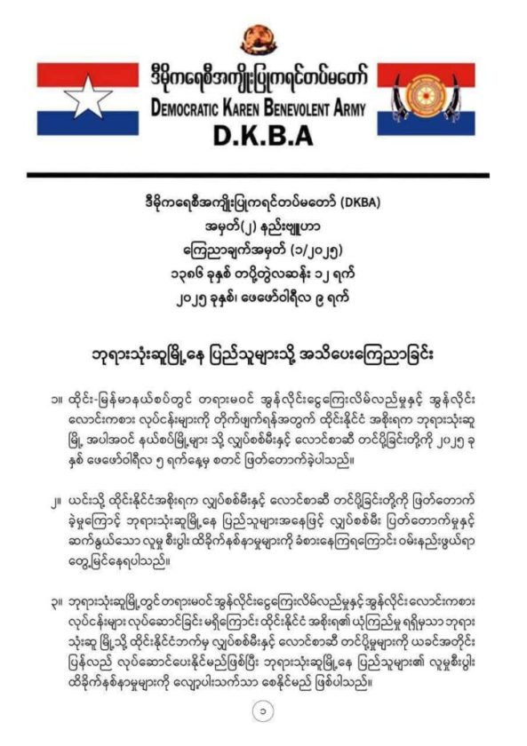 กองทัพกะเหรี่ยงประชาธิปไตย (DKBA) ลำดับที่ (2) แถลงการณ์ยุทธศาสตร์ ที่ (1/2568) 1386, 2568, ประกาศถึงชาวเจดีย์ตรีสุ(พญาตองซู)