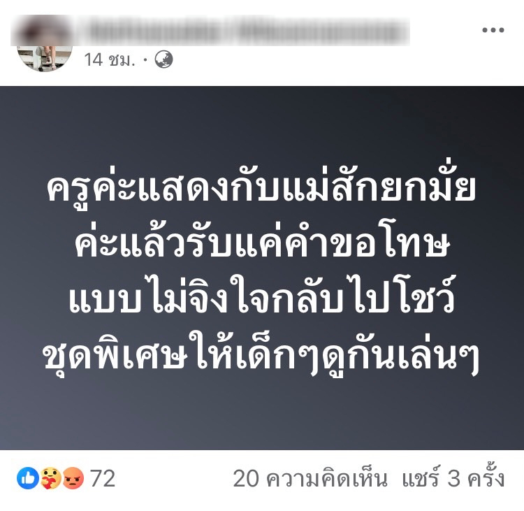 ทั้งนี้คุณแม่ไม่ได้ติดใจหรืออยากจะมีปัญหากับน้องๆทั้ง4 คนเลยที่ทำร้าย แต่ติดใจที่ว่าทำไมครูถึงคิดการแสดงนี้ขึ้นมาและทำไมถึงทนดูเด็กเล่นกันรุนแรงแบบนี้ได้ไม่เอะใจเลยหรอว่าอาจมีการบาดเจ็บกันเกิดขึ้นถึงปล่อยไปได้ยังไง และคุณแม่ไม่ได้อยากให้ผอ.หรือครูคนอื่นๆมารับผิดชอบแต่แม่อยากจะให้ครูคนนั้นที่ควบคุมการแสดงมารับผิดชอบเองก็เท่านั้นอย่างน้อยแม่ก็แค่อยากได้คำขอโทษ ส่วนค่ารักษาพยาบาลคุณแม่ไม่เอาแล้ว