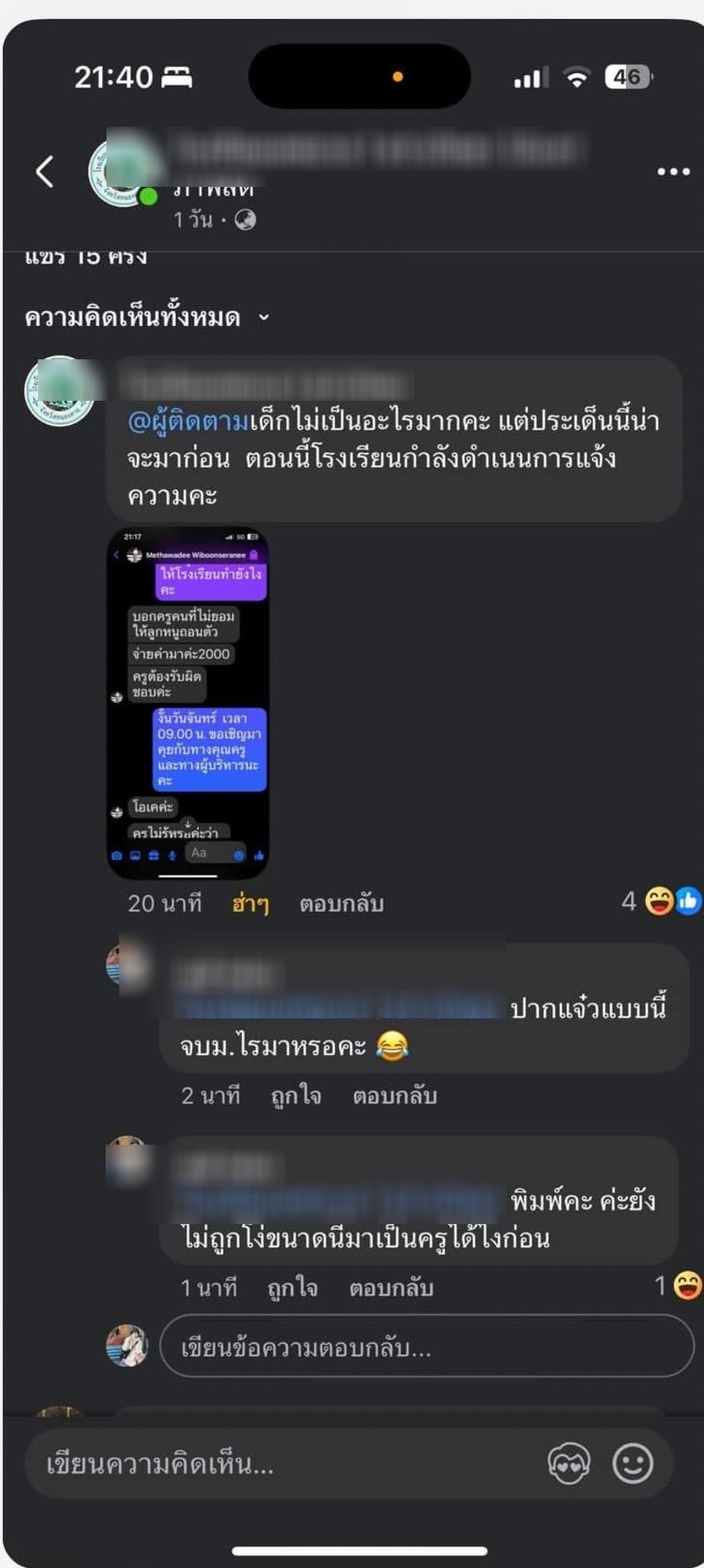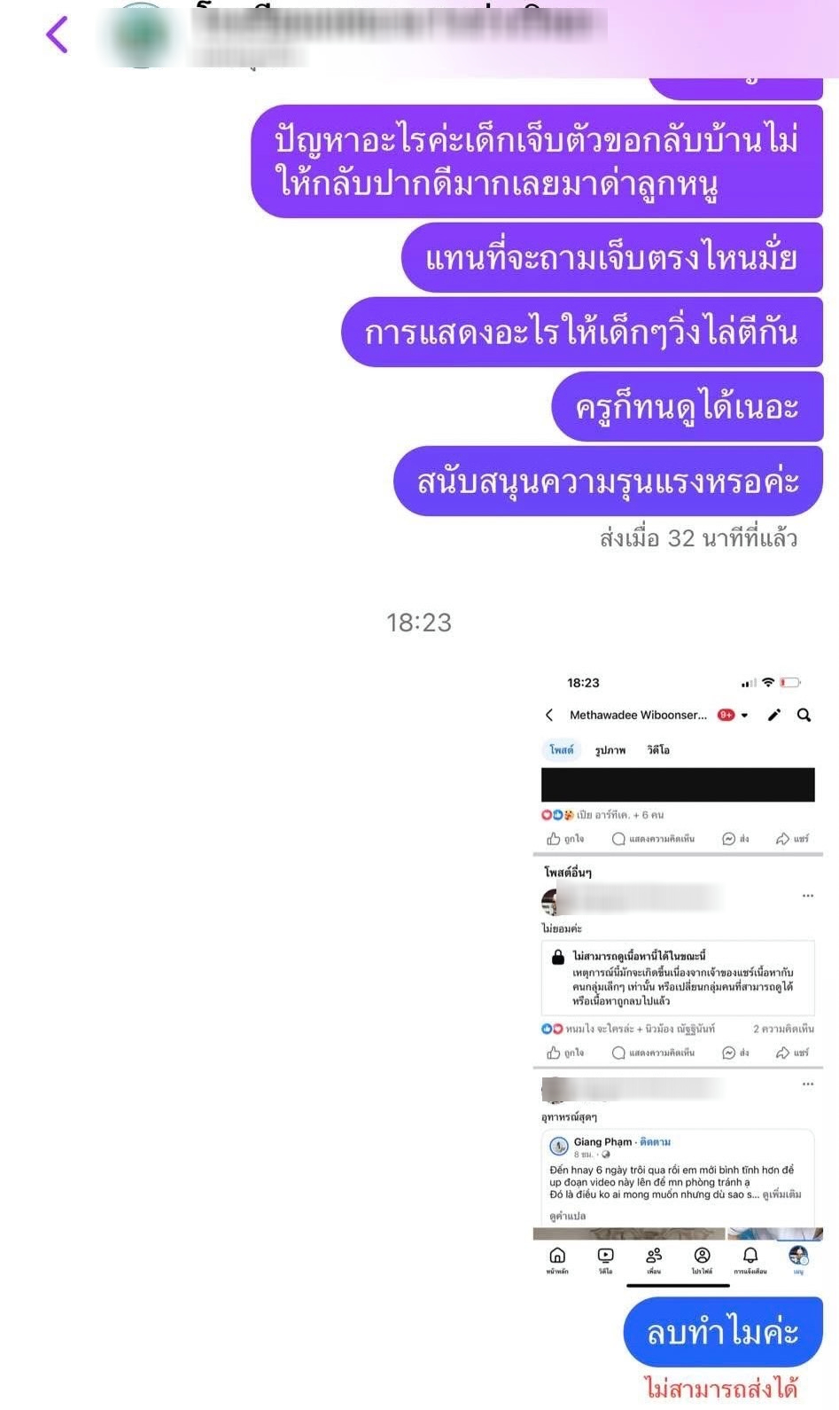 หลังจากนั้นน้องเลยโทรไปบอกแม่ว่าอยากกลับบ้านแต่ทางโรงเรียนไม่อนุญาติให้กลับจนกระทั่งสุดท้ายป้าไปรับกลับมาจึงได้เห็นบาดแผลที่ตัวน้องจากการโดนกระทำ เช้าวันต่อมาน้องบอกแม่ว่าหนูไม่ไปโรงเรียนได้ไหมหนูปวดหัว และแม่เลยพาไปโรงพยาบาลเสียค่ารักษาพยาบาลเองจ่ายค่ายาเอง โดยทางโรงเรียนไม่โทรมาหาหรือไม่คิดที่จะมาแสดงความรับผิดชอบเลยแม่กระทั่งค่ายาหรือค่ารักษาพยาบาล