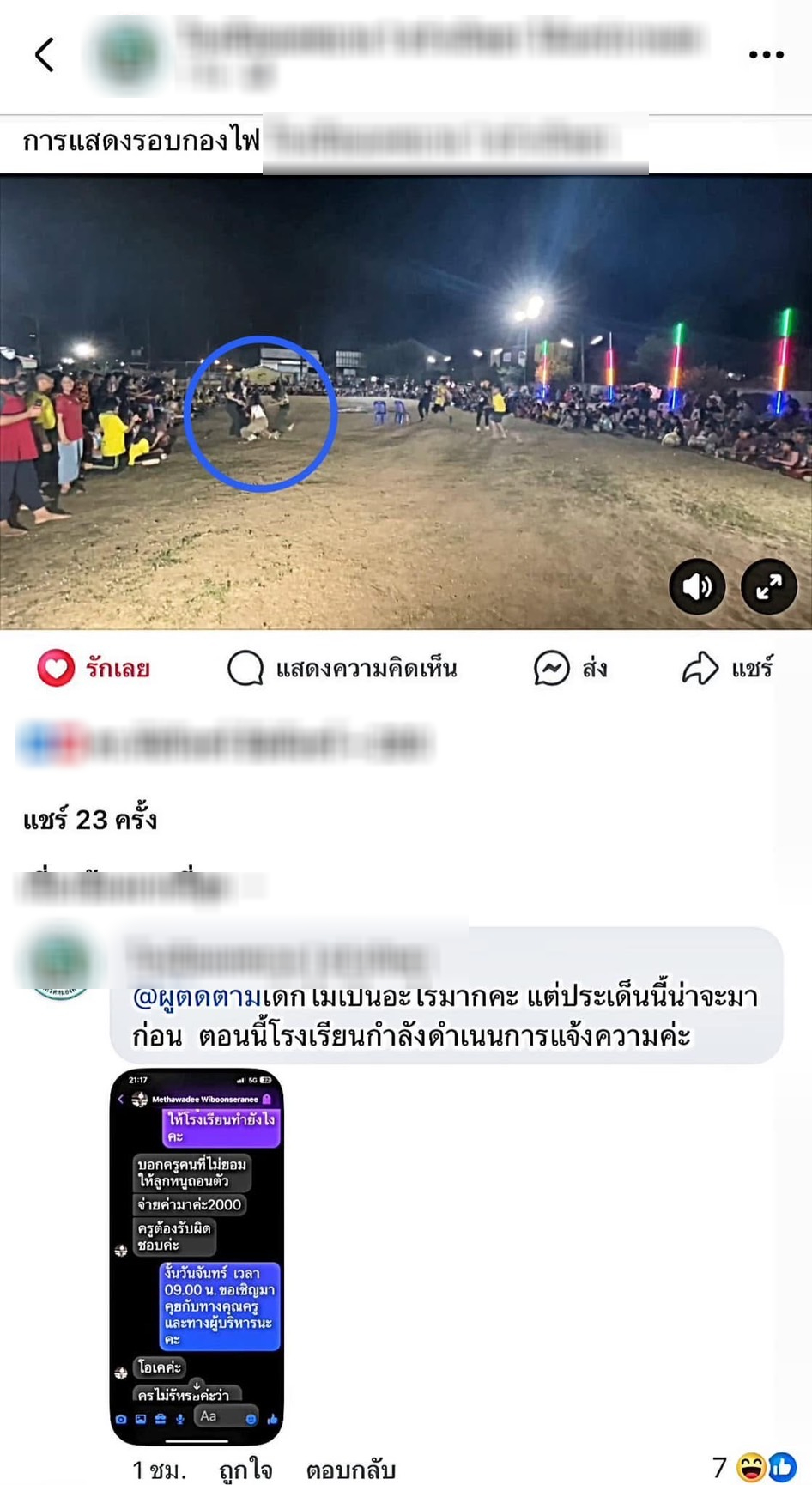 ต่อมาพอถึงวันจริงก็เกิดเหตุการณ์นี้ขึ้น โดยเป็นการแสดงรอบกองไฟที่เล่นจริงเจ็บจริง ซึ่งฉนวนเหตุมาจากเพื่อนในกลุ่มนั้นไม่ได้ชอบในตัวน้องเป็นการส่วนตัวจนเกิดเป็นการทำร้ายกันเกิดขึ้น ภายหลังการแสดงเสร็จสิ้นน้องได้เดินไปร้องไห้ที่ห้องน้ำหลังจากนั้นมีเพื่อนไปฟ้องคุณครู ทางคุณครูเลยมาบอกว่าอย่าดราม่าอย่าสร้างปัญหา