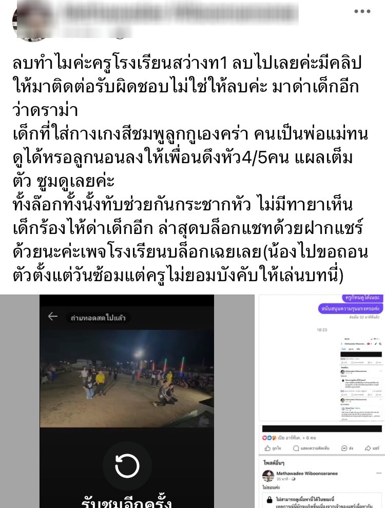 ล่าสุดคุณแม่ได้ออกมาเปิดใจกับทีมข่าวโดยคุณแม่เล่าว่า วันที่คุณครูมาบอกให้ลูกไปแสดงแล้วลูกไปแสดง ลูกมาบอกว่าเพื่อนเล่นแรงเล่นจริงหนูเจ็บหนูขอถอนตัวได้ไหม แต่พอน้องไปบอกกับคุณครูว่าหนูไม่อยากแสดงแล้วหนูขอถอนตัวได้ไหม แต่ทางคุณครูเขาไม่ยอมให้ถอนตัว