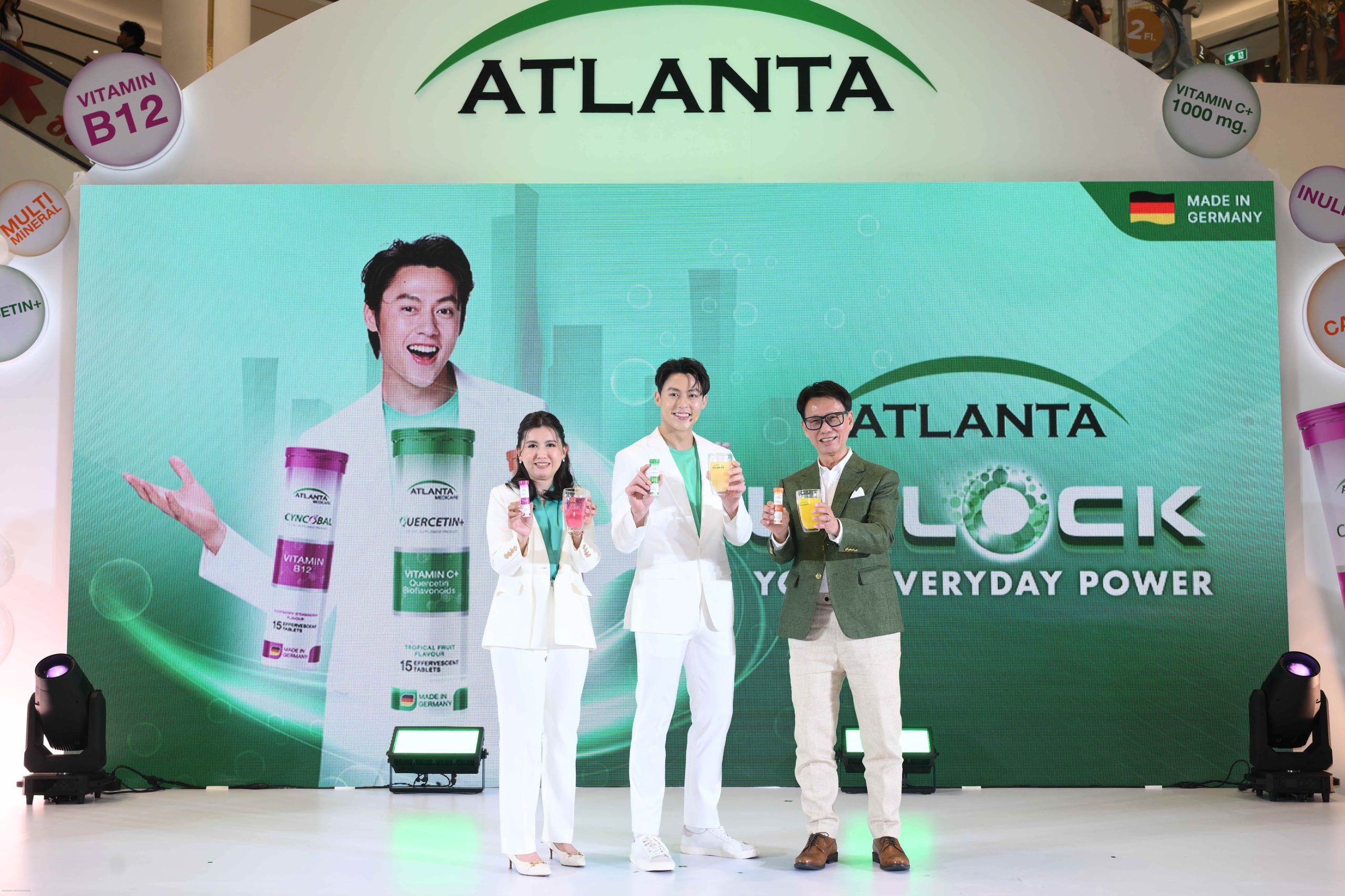 สำหรับผลิตภัณฑ์เสริมอาหาร “วิตามินเม็ดฟู่ดูดซึมเร็ว” แบรนด์แอตแลนต้า เพื่อการดูแลสุขภาพแบบครบทุกมิติ ตอบโจทย์คนยุคใหม่ที่ต้องการทั้งความสะดวกและสุขภาพที่แข็งแรงในทุก ๆ วัน มีให้เลือก 3 สูตร ได้แก่ Quercetin+ รสทรอปิคัลฟรุ๊ต ผสานเควอซิติน วิตามินซี 1,000 มล. และไบโอฟลาโวนอยด์จากส้ม ช่วยเสริมภูมิคุ้มกัน บำรุงการทำงานของปอด ทั้งยังช่วยส่งเสริมการปกป้องระบบทางเดินหายใจจากฝุ่น PM 2.5, Cyncobal รสราสเบอร์รี่-สตรอว์เบอร์รี่ อุดมด้วยวิตามินบี12 และอินูลิน มีส่วนช่วยบำรุงระบบประสาทและสมอง ป้องกันโรคอัลไซเมอร์ และอาการอ่อนเพลีย และ Physocal รสส้ม ที่ผสานมัลติ-มิเนอรัล ช่วยรักษาสมดุลของแร่ธาตุในร่างกาย และช่วยปลดล็อกศักยภาพของร่างกายให้พร้อมรับทุกความท้าทายในแต่ละวัน