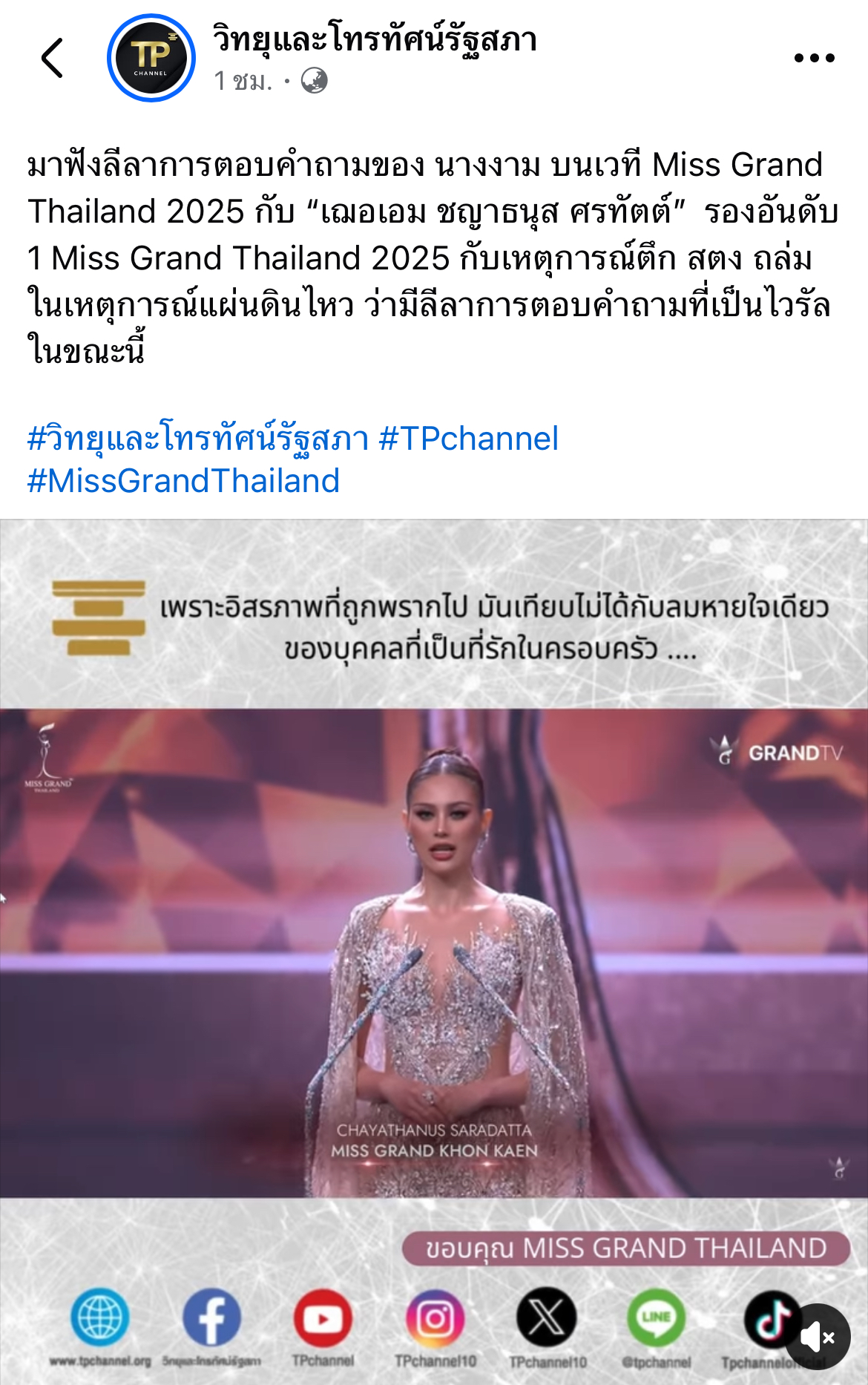 เสร็จสิ้นไปเป็นที่เรียบร้อยแล้ว สำหรับการประกวดมิสแกรนด์ไทยแลนด์ 2025 โดย“เฌอเอม ชญาธนุส ศรทัตต์” มิสแกรนด์ขอนแก่น คว้าตำแหน่งรองอันดับ 1 ไปครอง ล่าสุดการตอบคำถามของเธอยังทัชใจใครหลายๆคนเมื่อได้ฟังยังขนลุกไม่หาย ทางเพจรัฐสภาได้โพสต์คลิปของเธอพร้อมแคปชั่นนี้ว่า…