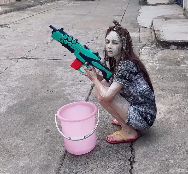 เท่านั้นยังไม่พอ “แม่เป้ย” ยังหอบอุปกรณ์คู่ใจสำหรับสงกรานต์ ทั้งกระป๋องใส่น้ำใบสีชมพู และปืนฉีดน้ำ เดินออกมาหน้าบ้าน พร้อมชะเง้อคอมองไปตามถนน ด้วยความหวังว่าจะมีรถยนต์หรือผู้คนผ่านมาให้ได้สาดน้ำคลายร้อนกันสักที
