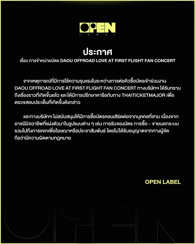 ซึ่งหลังเกิดเหตุการณ์รุนแรงดังกล่าวขึ้นทางค่ายต้นสังกัดของ ต้าห์อู๋-ออฟโรด ก็ไม่นิ่งนอนใจ ได้ออกมาแถลงการณ์เป็นที่เรียบร้อย โดยไม่สนับสนุนให้มีการซื้อบัตรคอนเสิร์ตต่อจากบุคคลที่สาม เนื่องจากอาจมีมิจฉาชีพที่แฝงตัวมาในรูปแบบต่างๆ เช่น การรับจองบัตร การซื้อ-ขายนอกระบบ รวมไปถึงการแจกเพื่อโฆษณาหรือประชาสัมพันธ์ โดยไม่ได้รับอนุญาตจากทางผู้จัด ถือว่ามีความผิดทางกฏหมาย