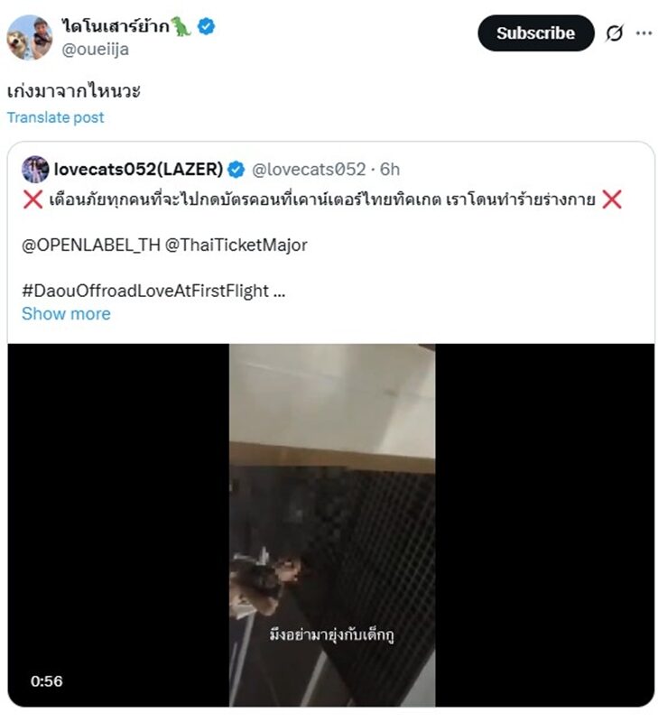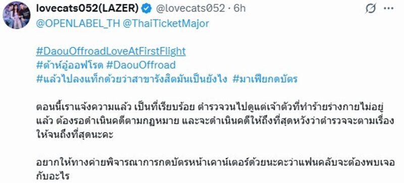 ผู้ใช้บัญชี X ได้โพสต์ลงในแอคเคาต์ส่วนตัว @lovecats052 เตือนภัยทุกคนที่จะไปกดบัตรคอนที่เคาน์เตอร์ไทยทิคเกต เหตุเพราะโดนทำร้ายร่างกายและข่มขู่ ขณะต่อคิวซื้อบัตร