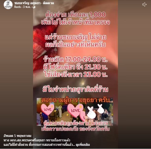 “ช่วงกลางเดือนมกราคม มีตำรวจเข้ามาตรวจร้าน ขอดูใบอนุญาต ซึ่งเราก็ให้ตรวจตามปกติ ไม่ได้มีปัญหาอะไร จนวันที่ 1 กุมภาพันธ์ มีผู้ชายโทรมา อ้างตัวว่าเป็นสารวัตร พูดจาในลักษณะว่า ถ้าอยากให้ร้านสงบ ไม่โดนตรวจถี่ ก็ขอรับเงินเดือนละ1,000 กับค่าตู้แดงอีก 500 บาท”