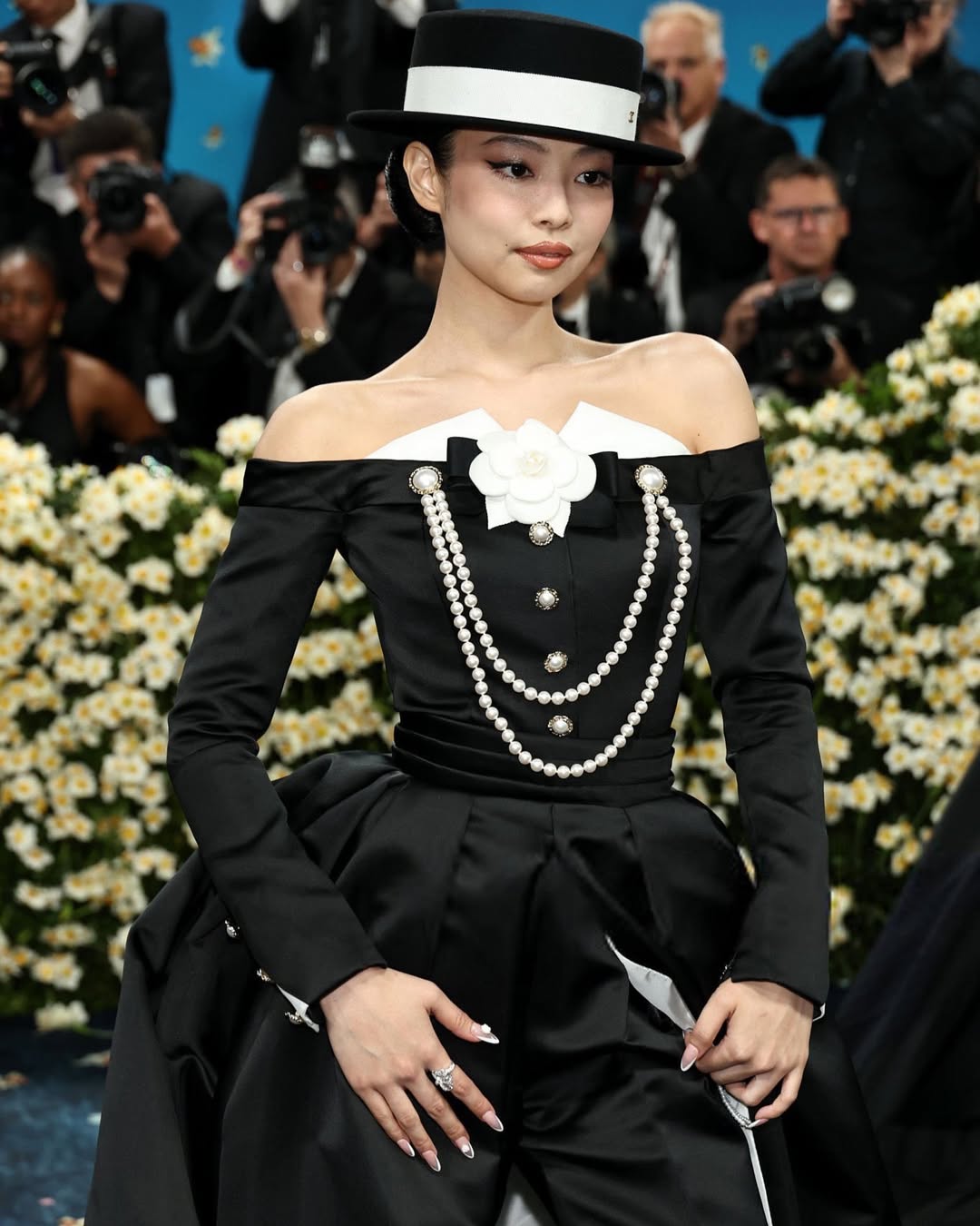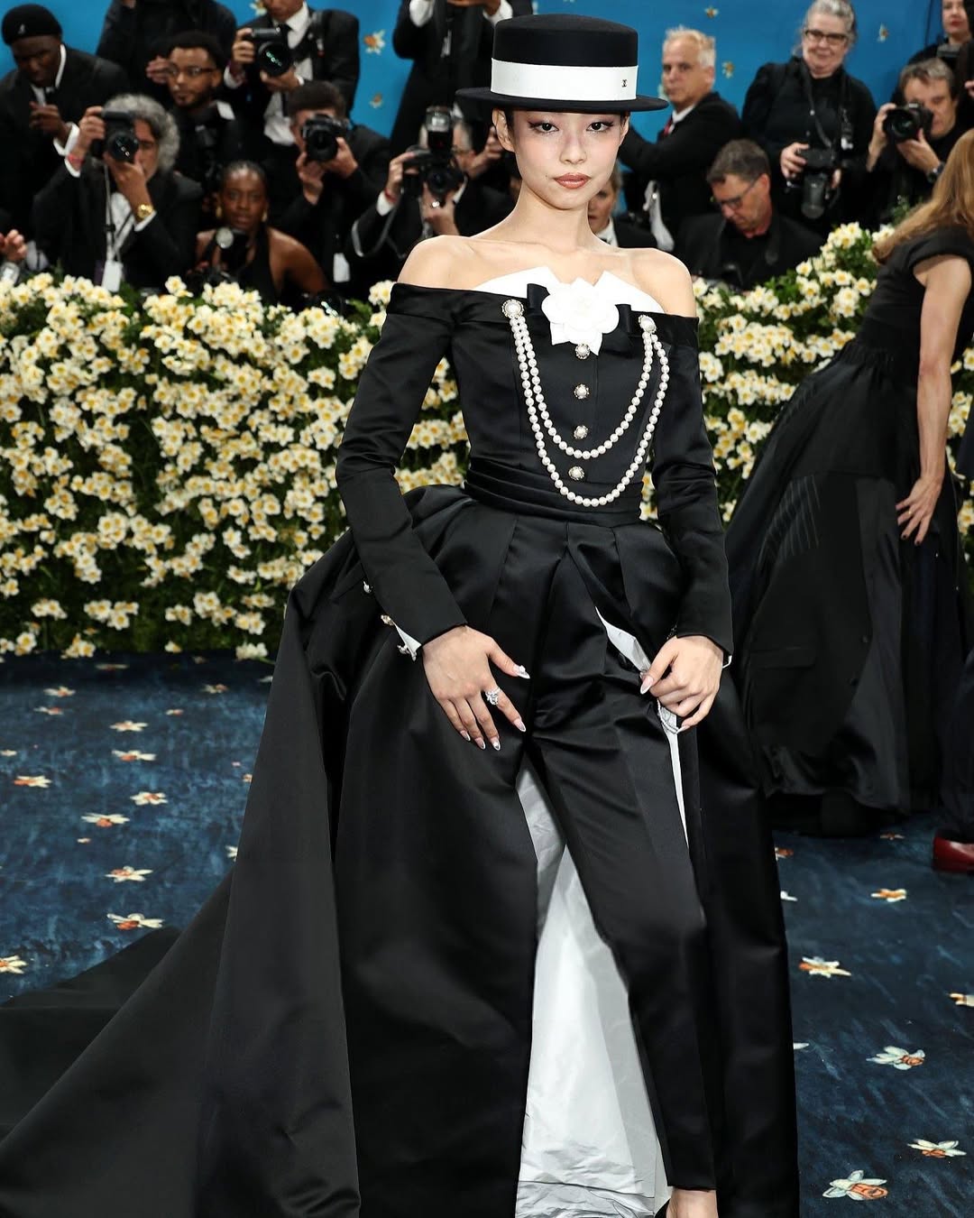 โดยคนแรกที่มาถึงงาน คือ เจนนี่ เธอสวมชุดทักซิโด้ของ Chanel พร้อมจั๊มสูทสีดำเข้ารูป ตกแต่งด้วยดอกไม้สีขาวและไข่มุกอันเป็นเอกลักษณ์ของ Chanel เจนนี่ ให้สัมภาษณ์บนพรมแดงว่าลุกส์นี้ได้รับแรงบันดาลใจมาจากรันเวย์ของ โคโค่ ชาแนล ในช่วงยุค 1920 และ 1930 ซึ่งเธอสามารถพรีเซนต์แบรนด์ได้สง่างามสมกับตำแหน่งแบรนด์แอมบาสเดอร์