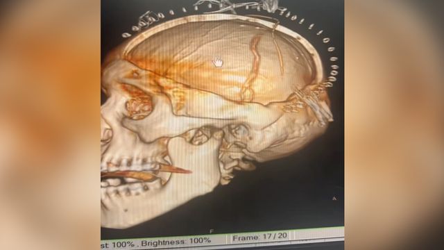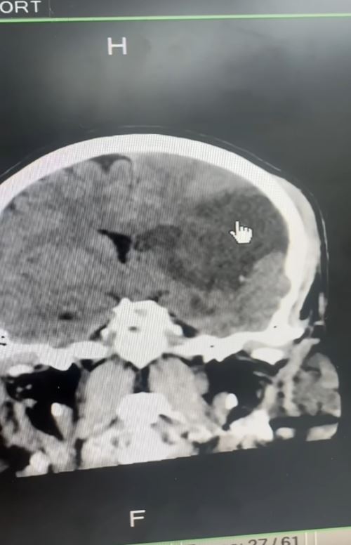 หมอสแกนสมอง พบเนื้อสมองบางส่วนตาย ตรงสีดำในภาพ CT แสดงว่าเกิน 8 ชั่วโมง ปกติคนเรามีเส้นเลือดไปเลี้ยงสมอง 4 เส้น คือ หน้าขวา หน้าซ้าย หลังขวา และหลังซ้าย แต่คนไข้รายนี้เส้นเลือดหายไปเหลือ 3 เส้น เกิดจากเส้นเลือดที่คอปริแตก ลิ่มเลือดไปอุดตันเส้นเลือดตัวเอง เนื่องจากคนไข้เส้นเลือดสมองตันในเวลากลางคืน เลยเวลาที่จะทำอะไรได้ จึงต้องผ่าตัดเปิดกะโหลกเพื่อลดแรงดันในสมอง