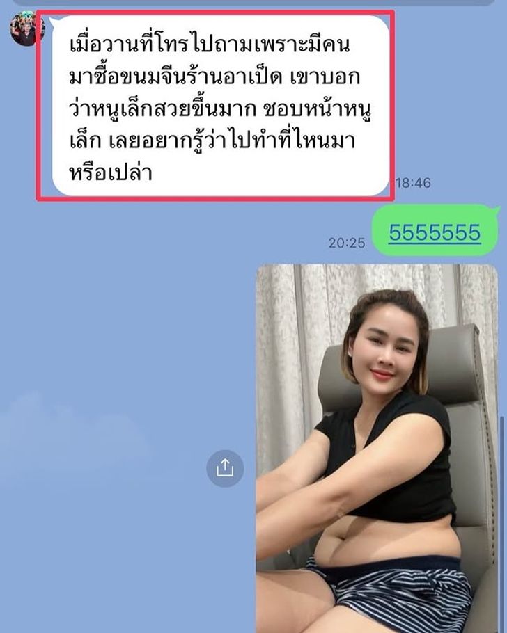 ซึ่ง หนูเล็ก ได้เขียนแคปชั่นประกอบไว้ว่า “ขอบคุณมากนะคะที่ชมหนู แต่ ทำไมไม่มีใครเชื่อว่าหนูอ้วน 555 มีแต่คนบอกไปทำหน้ามา หนูไม่เคยฉีดผิว ไม่เคยไปทำหน้า ไม่เคยทำศัลยกรรมอะไรทั้งสิ้น และที่หน้าเปลี่ยน แค่หนูอ้วนจาก 45 เป็น 56 โล แค่นั้นเอง ไม่ได้ปล่อยตัวแค่เป็นไทรอย แต่ตอนนี้หายแล้ว