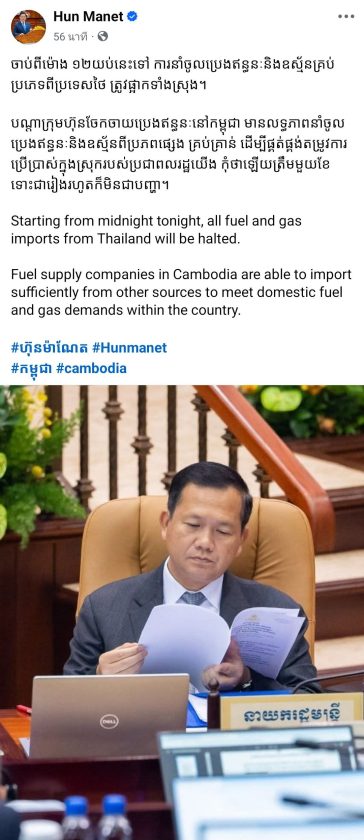 วันนี้ (22 มิ.ย.2568) นายกรัฐมนตรีกัมพูชา ฮุน มาเนต ประกาศผ่านโซเชียลมีเดียว่า ตั้งแต่หลังเที่ยงคืนวันนี้ กัมพูชาจะระงับการนำเข้าน้ำมันและก๊าซทุกชนิดจากประเทศไทยอย่างสิ้นเชิง โดยยืนยันว่ารัฐบาลมีศักยภาพเพียงพอในการจัดหาเชื้อเพลิงจากแหล่งอื่น เช่น เวียดนาม สิงคโปร์ หรือมาเลเซีย เพื่อตอบสนองความต้องการของประชาชน ไม่เฉพาะแค่เดือนเดียว แต่มั่นใจสามารถตอบสนองความต้องการของประชาชนได้ “ตลอดไป”