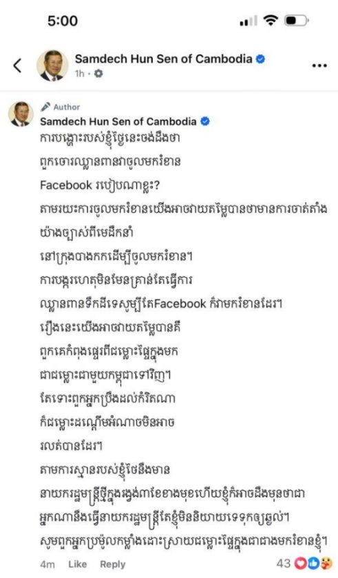 วันนี้ (24 มิ.ย. 68) สมเด็จฯ ฮุน เซน ประธานวุฒิสภากัมพูชา โผล่คอมเมนต์ใต้โพสต์ของตัวเองที่กล่าวถึงลูก ๆ โดยในคอมเมนต์ระบุว่า ข้าพเจ้าถูกกลุ่มคนคนเข้ามาก่อกวนในเฟซบุ๊ก แต่จากการก่อกวนครั้งนี้ เราสามารถประเมินได้ว่ามีผู้นำในกรุงเทพฯ ออกคำสั่งให้ผู้คนเหล่านั้นมาก่อกวน ไม่เพียงแค่บุกรุกดินแดนเท่านั้น แต่เฟซบุ๊กเองก็ถูกบุกรุกด้วยเช่นกัน ซึ่งเราประเมินได้ว่าพวกเขากำลังเปลี่ยนจากความขัดแย้งภายในประเทศไปสู่ความขัดแย้งกับกัมพูชา แต่ไม่ว่าพวกคุณจะพยายามมากขนาดไหน การต่อสู้เพื่ออำนาจก็ไม่สามารถยุติลงได้