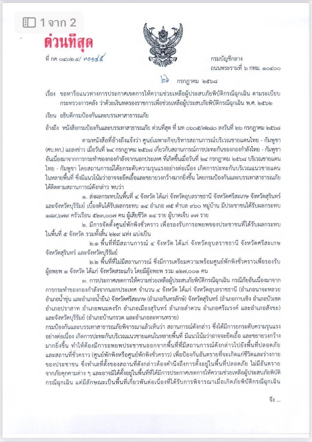 28 กรกฎาคม ผู้สื่อข่าวรายงานว่า นายชำนาญ ชื่นตา ผู้ว่าราชการจังหวัดสุรินทร์ ลงนามในประกาศด่วนที่สุด ถึงนายอำเภอ ทุกอำเภอ นายกองค์การบริหารส่วนจังหวัดสุรินทร์ และนายกเทศมนตรีเมืองสุรินทร์