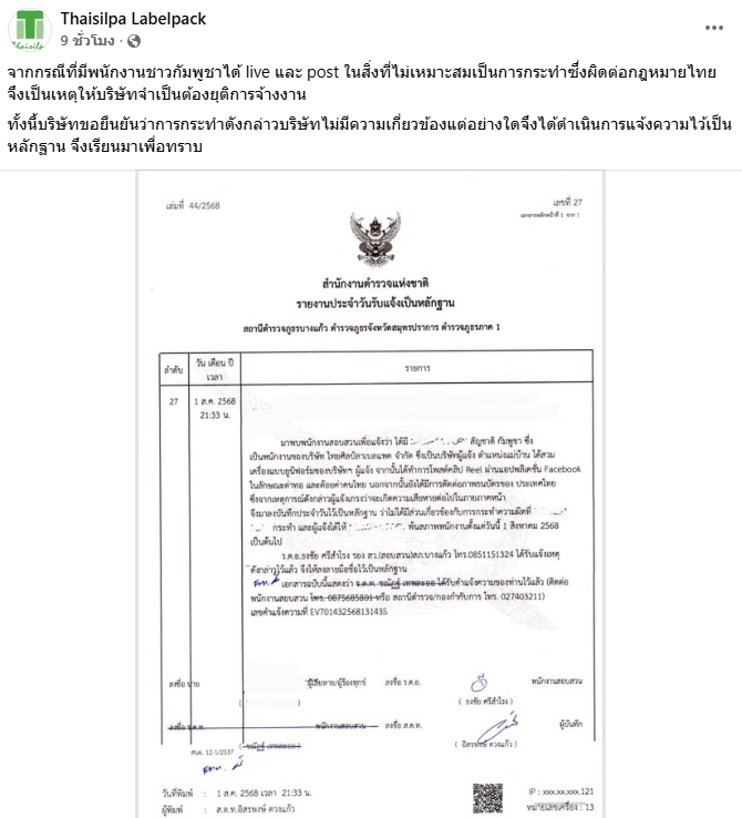 2 ส.ค. 68 เพจเฟซบุ๊ก Thaisilpa Labelpack ชี้แจงกรณีที่พนักงานชาวกัมพูชาโพสต์ดูหมิ่นคนไทย และได้ไปแจ้งความบันทึกประจำวันไว้ที่ สภ.บางแก้ว จ.สมุทรปราการ