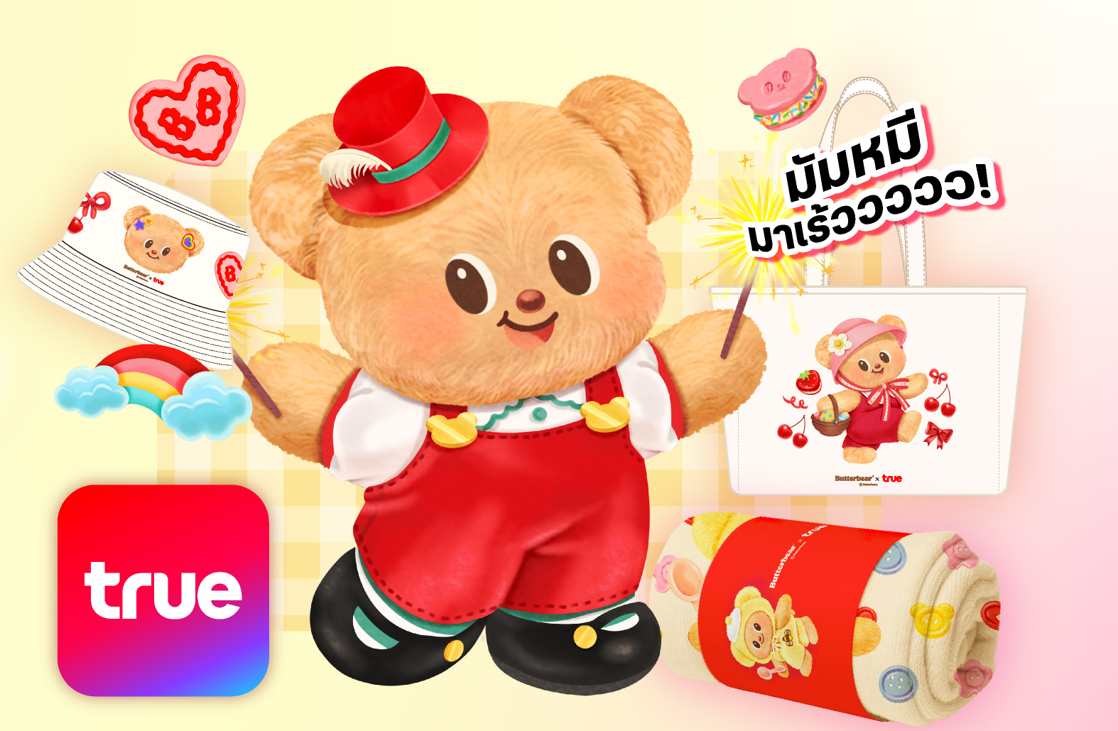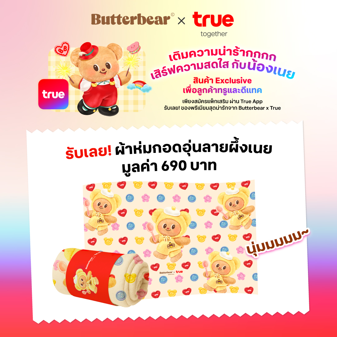 - ลูกค้าปัจจุบัน ทั้งแบบเติมเงิน และรายเดือน เพียงทำรายการ ผ่าน True App รับของพรีเมียม Butterbear x True ลิมิเต็ด อิดิชั่น ตั้งแต่วันนี้ ถึง 31 ธันวาคม 2568