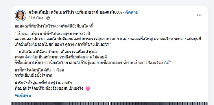 ท้ายที่สุด ผลตรวจออกมาว่าไม่ได้มีความผิดปกติร้ายแรง และแก้มบุ๋มเองก็มีปัญหาสุขภาพเล็กน้อยเช่นกัน ทำให้ทั้งคู่ตัดสินใจฉลองเล็กๆ ด้วยเค้กก้อนหนึ่ง พร้อมมอบของขวัญเป็น นาฬิกาโรเล็กซ์เรือนหรูสำหรับใส่คู่กัน
