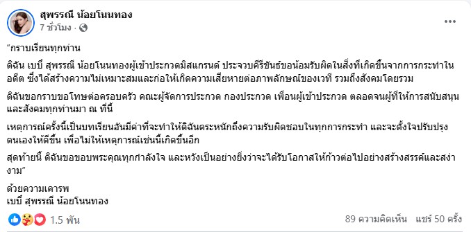 “บี๋อาจเคยเดินเส้นทางผิด แต่หนูก็มีสิทธิ์เลือกเส้นทางใหม่ อยากให้สังคมและกองประกวดให้โอกาส หนูขอโทษทุกคนจริงๆ” – เบบี๋ กล่าว