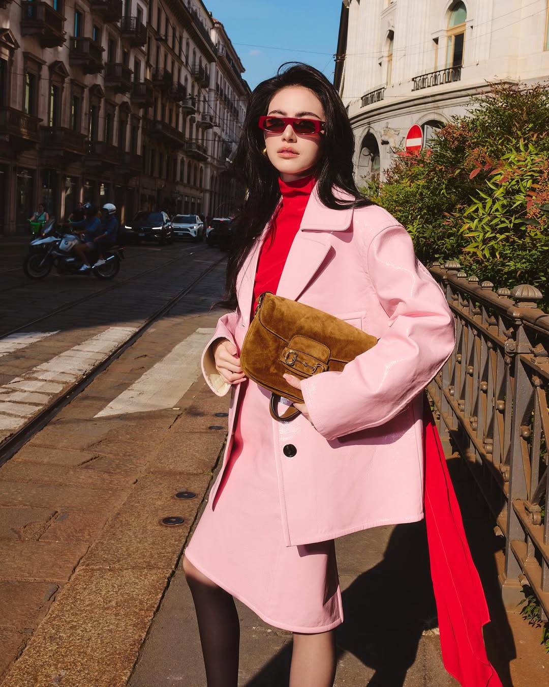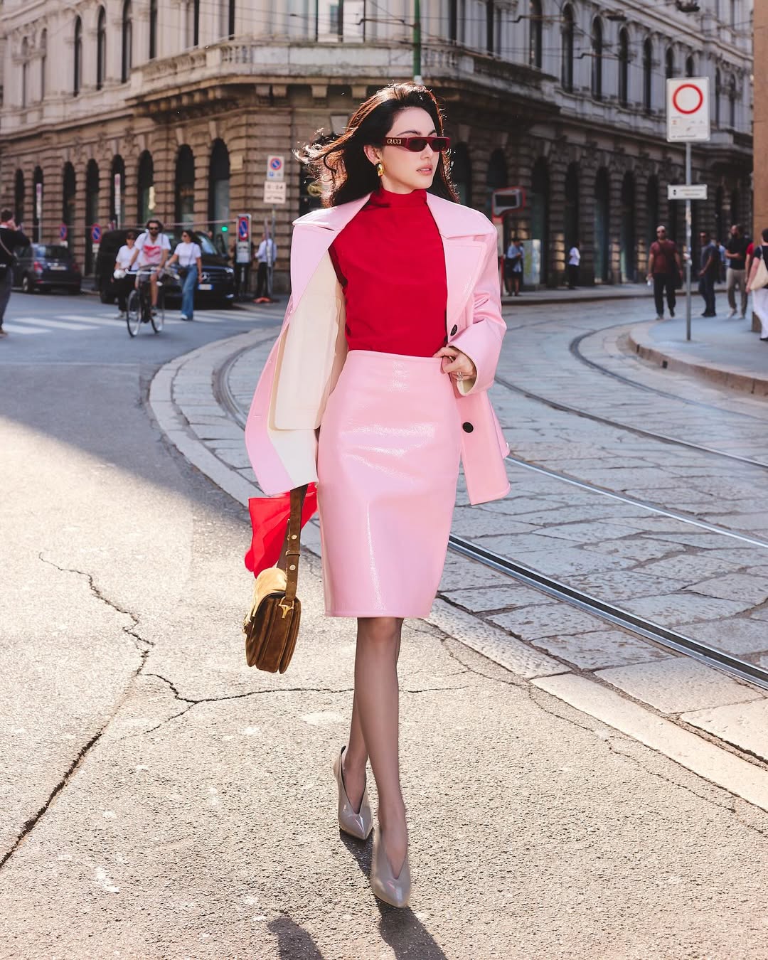 ล่าสุดกับลุคที่ทำเอาแฟนๆ ต้องร้องว้าว! ใหม่มาในชุด เสื้อคอเต่าสีแดงสด แมตช์กับ ชุดกระโปรงและเสื้อโค้ทสีชมพูบาร์บี้ ที่ทำจากวัสดุมันเงาวับเล่นแสงสุดๆ คอมพลีทลุคด้วย กระเป๋าสะพายข้างสีน้ำตาล และ รองเท้าส้นสูงสีเทาเบจ ที่ทำให้เธอดูสง่างามและโดดเด่นท่ามกลางบรรยากาศใจกลางเมืองมิลาน