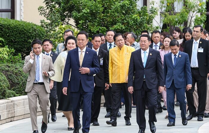 ต่อมาเมื่อเวลา 08.19 น. ที่ผ่านมา นายอนุทิน เดินทางถึงทำเนียบรัฐบาล ด้วยรถยนต์โรลส์รอยซ์ ทะเบียน วอ 3333 กรุงเทพมหานคร ถือเป็นการเข้าปฏิบัติหน้าที่ที่ตึกไทยคู่ฟ้าอย่างเป็นทางการวันแรก ทันทีที่มาถึงนายกฯ ได้ขึ้นไปยังห้องทำงาน และได้สักการะพระพุทธรูปที่อยู่ในห้อง จากนั้นเวลา 08.41 น. นายกฯ และรัฐมนตรี ได้ลงจากตึกไทยคู่ฟ้า เพื่อมาสักการะสิ่งศักดิ์สิทธิ์ประจำทำเนียบรัฐบาล ศาลพระภูมิเจ้าที่ ศาลตายาย เพื่อความเป็นสิริมงคล