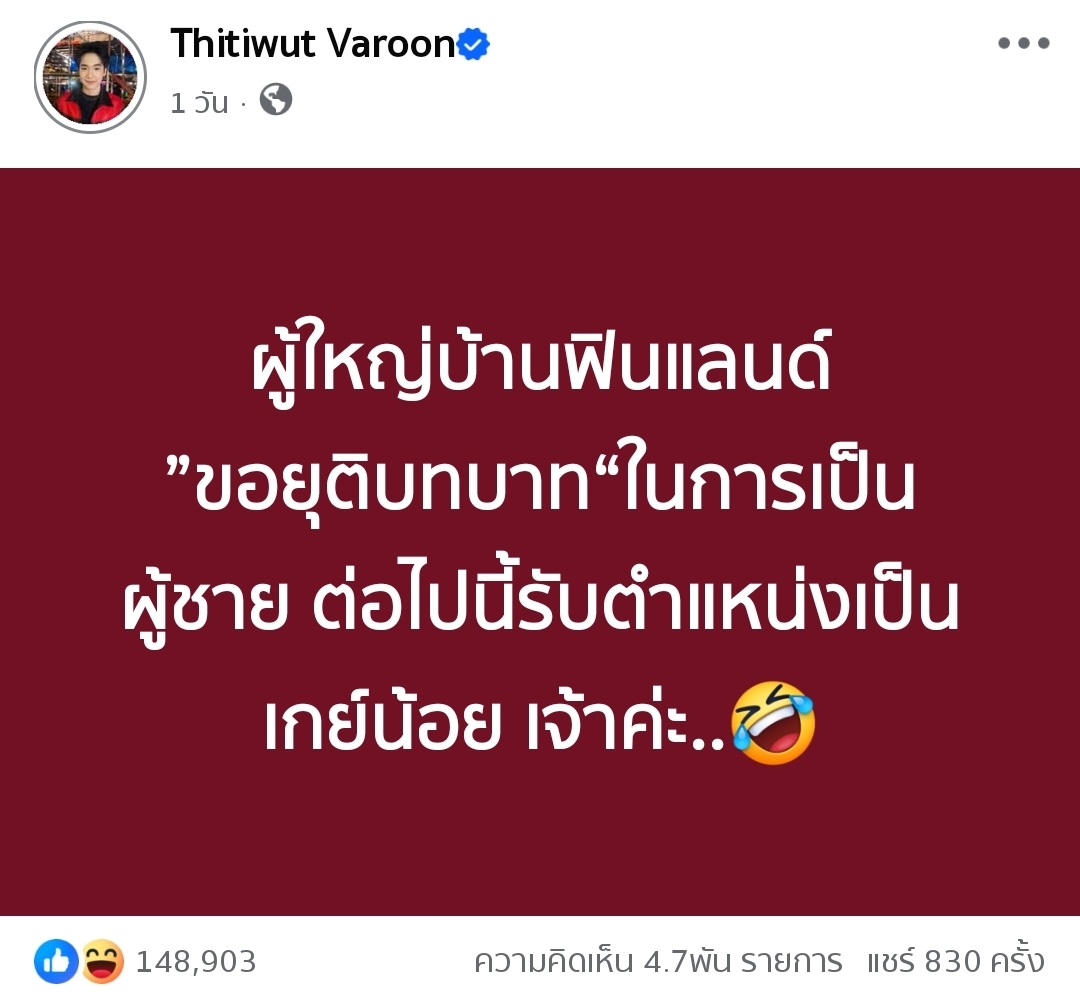 “ผู้ใหญ่บ้านฟินแลนด์ ”ขอยุติบทบาท“ในการเป็นผู้ชาย ต่อไปนี้รับตำแหน่งเป็นเกย์น้อย เจ้าค่ะ…🤣”