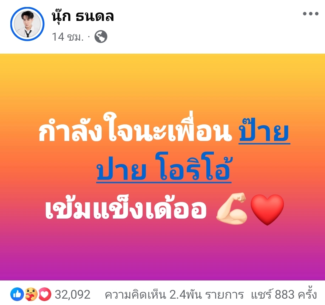เมื่อไม่นานมานี้ ป๊ายปาย โอริโอ้ ได้โพสต์ภาพขณะเข้าพักรักษาตัวในโรงพยาบาล ซึ่งสร้างความตกใจและเป็นห่วงให้กับแฟนคลับจำนวนมาก แต่ในเวลาต่อมา นุ๊ก ธนดล ก็ได้ออกมาเคลื่อนไหวทันที โดยโพสต์ภาพที่แสดงให้เห็นว่าเขากำลังวิดีโอคอลพูดคุยกับ ป๊ายปาย เพื่อให้กำลังใจอย่างใกล้ชิด พร้อมข้อความสั้น ๆ แต่เต็มไปด้วยความห่วงใยว่า “กำลังใจนะเพื่อน ป๊ายปาย โอริโอ้ เข้มแข็งเด้ออ”