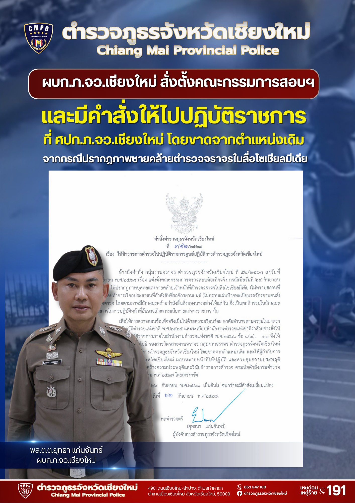 ความคืบหน้าล่าสุด วันที่ 27 กันยายน 2568 พล.ต.ต. ยุทธนา แก่นจันทร์ ผู้บังคับการตำรวจภูธรจังหวัดเชียงใหม่ ลงนามคำสั่งที่ 322/2568 ให้ รองสารวัตรสายงานจราจร กลุ่มงานจราจร ภ.จว.เชียงใหม่ ไปปฏิบัติราชการที่ ศูนย์ปฏิบัติการตำรวจภูธรจังหวัดเชียงใหม่ (ศปก.ภ.จว.เชียงใหม่) โดยขาดจากตำแหน่งเดิม พร้อมตั้งคณะกรรมการสอบสวนข้อเท็จจริง