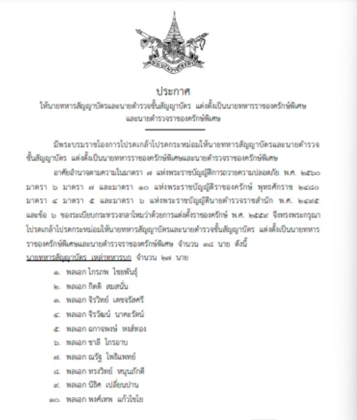 ราชกิจจานุเบกษา ประกาศ เผยแพร่ประกาศให้นายทหารสัญญาบัตรและนายตำรวจชั้นสัญญาบัตร แต่งตั้งเป็นนายทหารราชองครักษ์พิเศษและนายตำรวจราชองครักษ์พิเศษ มีพระบรมราชโองการโปรดเกล้าโปรดกระหม่อมให้นายทหารสัญญาบัตรและนายตำรวจชั้นสัญญาบัตร แต่งตั้งเป็นนายทหารราชองครักษ์พิเศษและนายตำรวจราชองครักษ์พิเศษ