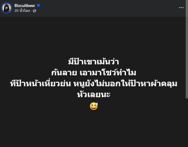 ฟาดกลับแบบแซ่บๆ ล่าสุด เบียร์ เดอะว้อยซ์ ออกมาโพสต์สเตตัส เจอคุณป้าท่านหนึ่งเข้ามาคอมเมนต์แซะ ติเรื่องก้นของสาวเบียร์ งานนี้มีหรือสาวเบียร์จะปล่อยผ่าน สู้กลับไปเลยค่าาา ว่า “ทีป้าหน้าเหี่ยวย่น หนูยังไม่บอกให้ป้าหาผ้าคลุมหัวเลยนะ” ว๊ายยยยอ่านแล้วเจ็บจี๊ดดดดเลยค่าาา พร้อมเมนต์เพิ่มเติมว่า “คือเบียร์ก็ไม่ได้อยากจะปากงี้ แต่เห็นแล้วแบบ ป้าเค้าคิดได้ไง บอกให้หาครีมมาทา ป้าทาหน้าตัวเองก่อนเลยจ้า”