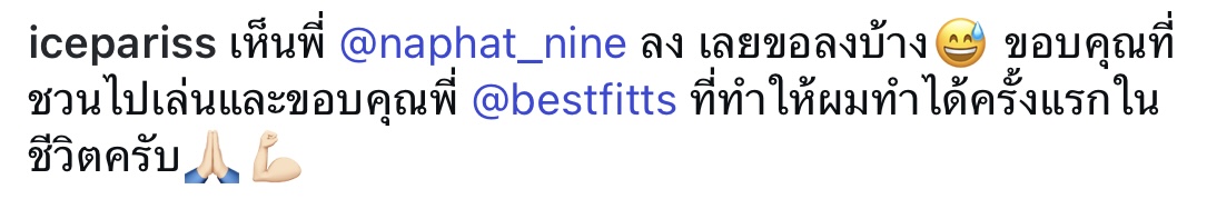 “เห็นพี่ @naphat_nine ลง เลยขอลงบ้าง 😅 ขอบคุณที่ชวนไปเล่น และขอบคุณพี่ @bestfitts ที่ทำให้ผมทำได้ครั้งแรกในชีวิตครับ 🙏🏻💪🏻”