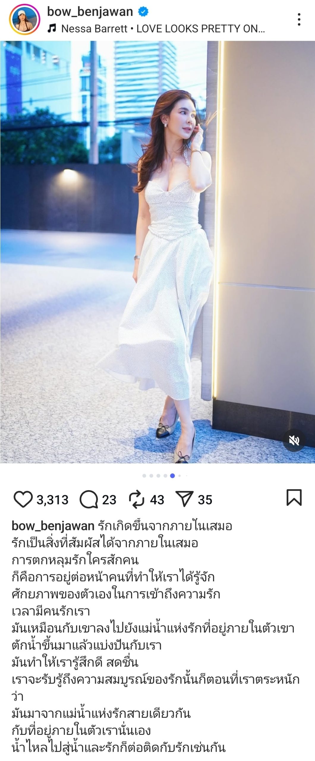 ​สาวโบว์ได้เผยถึงแก่นแท้ของความรักด้วยการเปรียบเปรยอย่างคมคาย โดยระบุข้อความว่า “รักเกิดขึ้นจากภายในเสมอ รักเป็นสิ่งที่สัมผัสได้จากภายในเสมอ การตกหลุมรักใครสักคน ก็คือการอยู่ต่อหน้าคนที่ทำให้เราได้รู้จักศักยภาพของตัวเองในการเข้าถึงความรัก” พร้อมทั้งเปรียบเทียบการได้รับความรักจากผู้อื่นว่า “มันเหมือนกับเขาลงไปยังแม่น้ำแห่งรักที่อยู่ภายในตัวเขา ตักน้ำขึ้นมาแล้วแบ่งปันกับเรา” ซึ่งข้อความนี้ชี้ให้เห็นว่าความรักที่สมบูรณ์นั้นแท้จริงแล้วมาจากแหล่งกำเนิดเดียวกันภายในตัวเรานั่นเอง โดยเธอปิดท้ายอย่างงดงามว่า “น้ำไหลไปสู่น้ำและรักก็ต่อติดกับรักเช่นกัน”