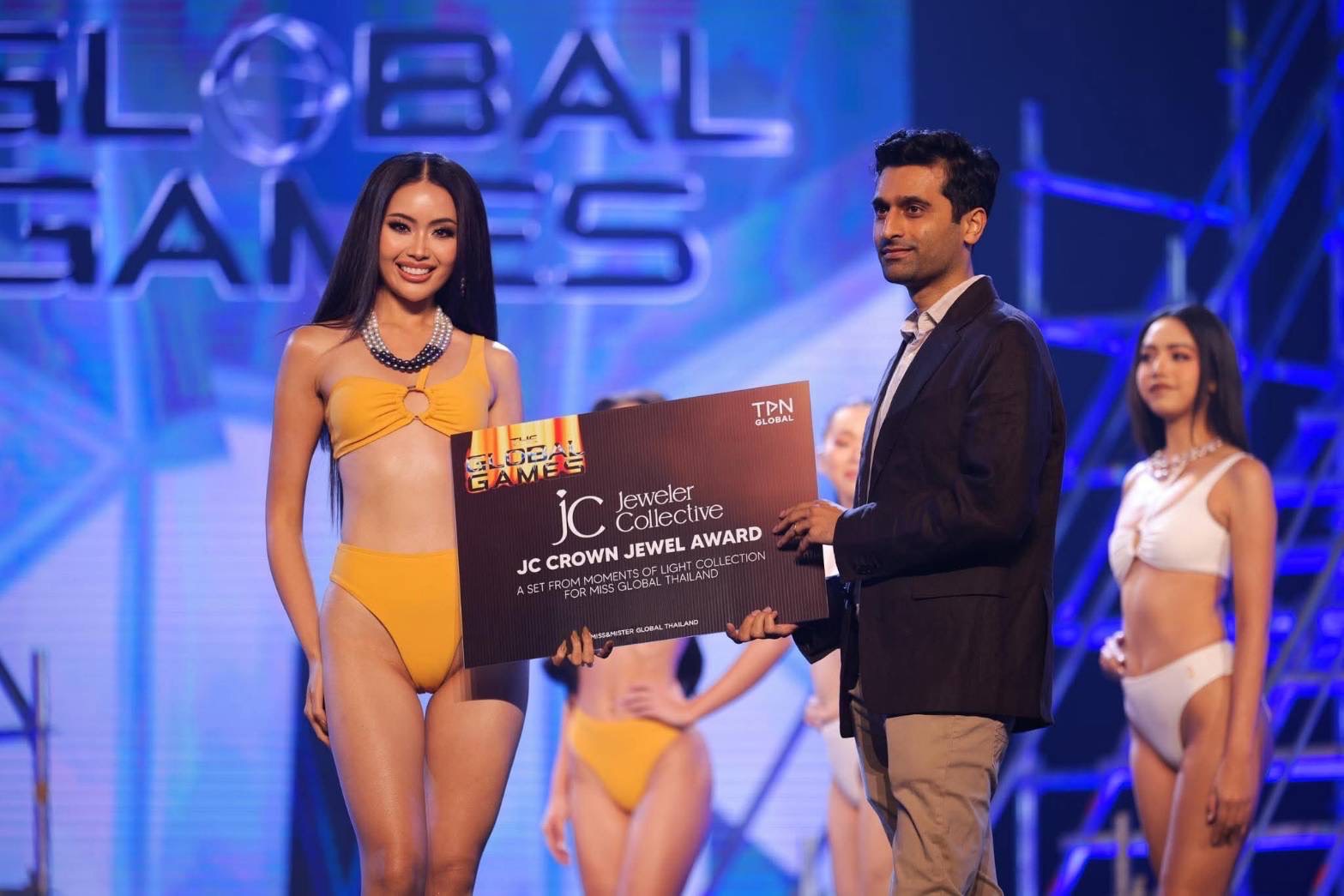 * JC Crown Jewel Award ตกเป็นของ ลูกตาล สุรารักษ์ เกียรติสูงเนิน กับสไตล์ลิ่งที่สร้างสรรค์สุดๆ! เธอเลือกสร้อยคอ “The Monochrome” (ไข่มุกขาว, เทา, ดำ) มาตัดกับชุดว่ายน้ำสีเหลืองสดใสได้อย่างลงตัวแบบ “ขัดแย้งแต่กลมกลืน” สะท้อนพลังความมั่นใจในทุกย่างก้าว