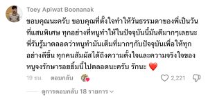 และครูเต้ยยังได้เข้ามาคอมเมนต์ต่ออีกว่า ขอบคุณนะครับ ขอบคุณที่ตั้งใจทำให้วันธรรรรมดาของพี่เป็นวันที่แสนพิเศษ ทุกอย่างที่หนูทำให้ในปัจจุบันนี้มันดีมากๆเลยนะ พีรับรู้มาตลอดว่าหนูทำมันเต็มที่มากๆกับปัจจุบันเพื่อให้ทุก อย่างดีขึ้น ทุกคนสัมผัสได้ถึงความตั้งใจและความจริงใจของ หนูจงรักษารอยยิ้มนี้ไปตลอดนะครับ รักนะ
