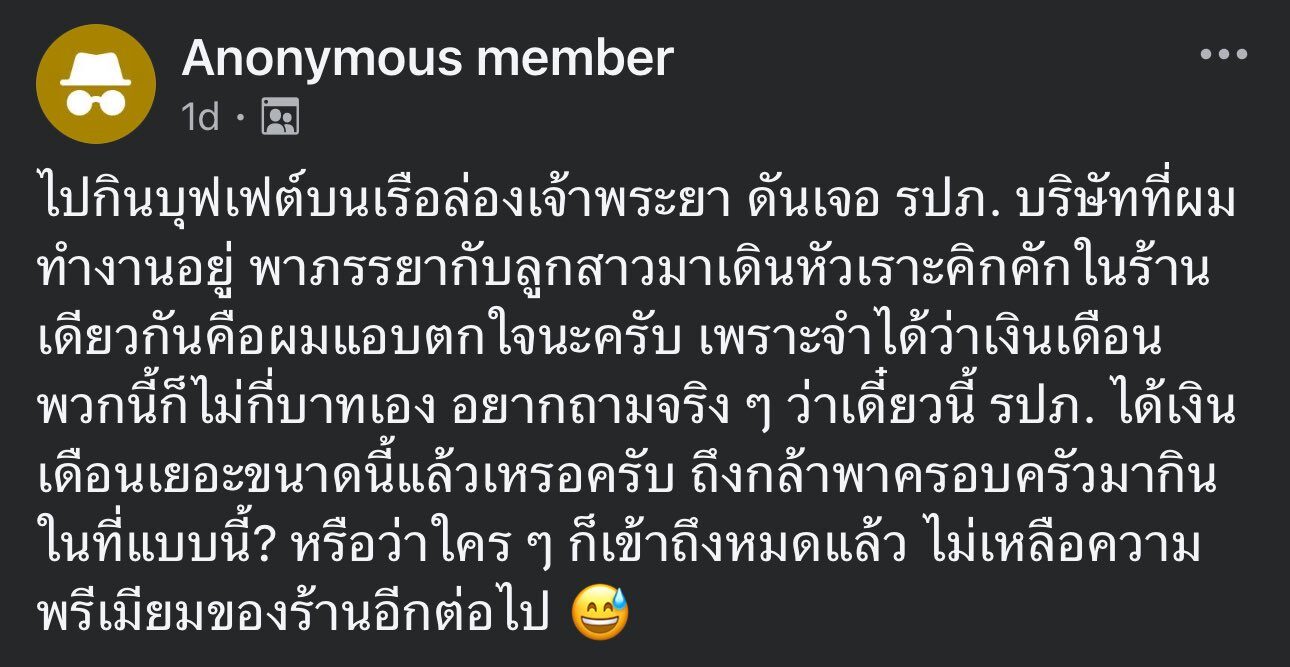 กลายเป็นประเด็นร้อนระอุ เมื่อชาวเน็ตซึ่งรายหนึ่ง ได้โพสต์เล่าเหตุการณ์ระบุว่า “ไปกินบุฟเฟต์บนเรือล่องเจ้าพระยา ดันเจอ รปภ. บริษัทที่ผมทำงานอยู่ พาภรรยากับลูกสาวมาเดินหัวเราะคิกคักในร้านเดียวกัน คือผมแอบตกใจนะครับ เพราะจำได้ว่าเงินเดือนพวกนี้ก็ไม่กี่บาทเอง อยากถามจริง ๆ ว่าเดี๋ยวนี้ รปภ. ได้เงินเดือนเยอะขนาดนี้แล้วเหรอครับ ถึงกล้าพาครอบครัวมากินในที่แบบนี้? หรือว่าใคร ๆ ก็เข้าถึงหมดแล้ว ไม่เหลือความพรีเมียมของร้านอีกต่อไป”