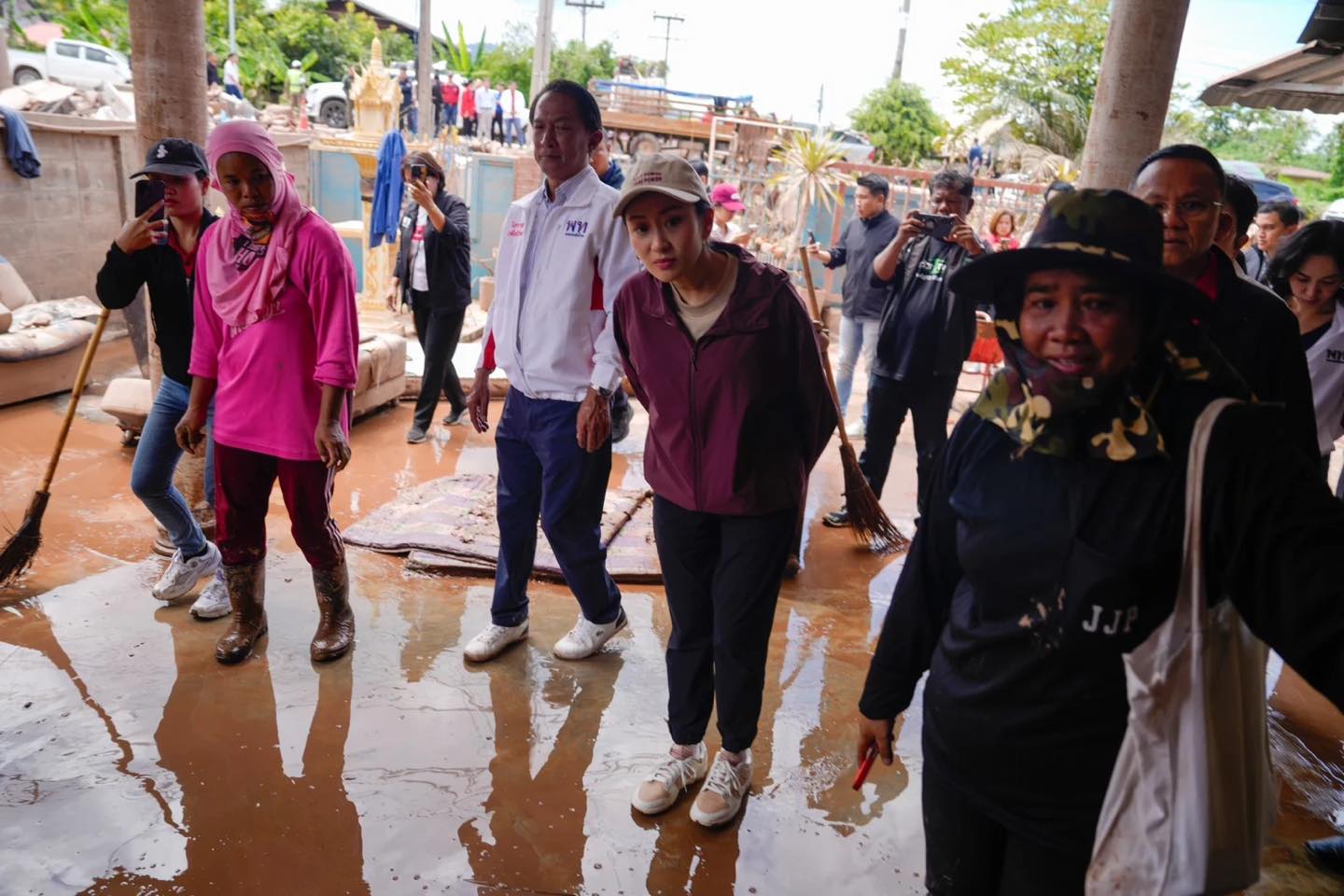 ซึ่งทุกหลังของ ต.น้ำอ่าง น้ำท่วมสูงระดับมิดชั้นหนึ่งของตัวบ้าน ชาวบ้านท่านหนึ่งเล่าถึงช่วงที่ต้องติดอยู่บนหลังคาเพื่อรอความช่วยเหลือ และบอกเล่าถึงการเคลียร์สถานที่หลังน้ำท่วม ซึ่งมีความยากลำบากและต้องการการเยียวยาสนับสนุน จากนั้น น.ส.แพทองธารพร้อมคณะ เดินเท้าต่อไปยังศาลาการเปรียญ วัดศรีสะอาด เพื่อพบกับพี่น้องประชาชนร่วมร้อยที่มารอต้อนรับและพูดคุยกับอดีตนายกฯ
