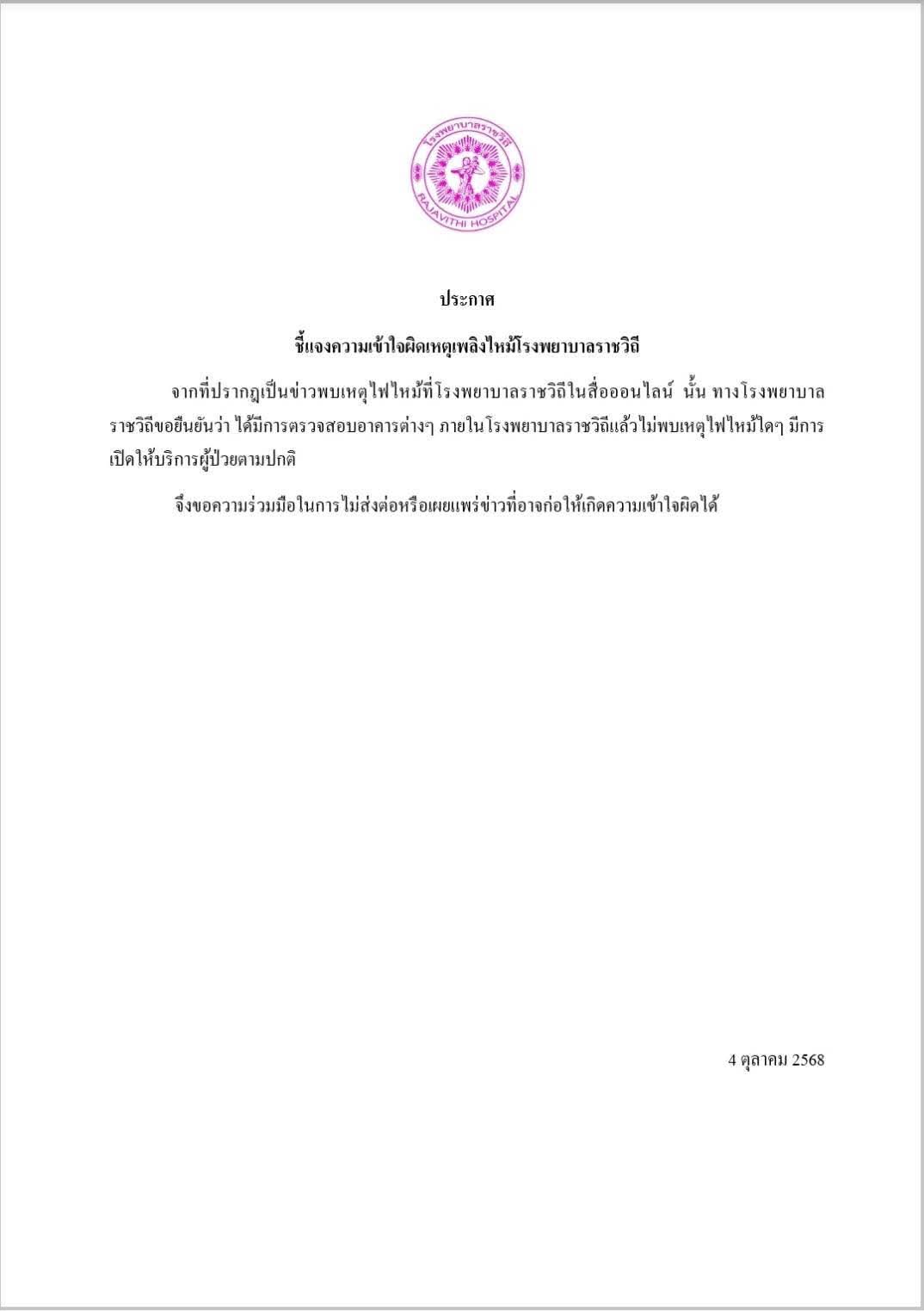 “รพ.ราชวิถี” ยืนยันหนักแน่นว่า ได้ตรวจสอบอาคารทุกจุดแล้ว “ไม่พบเหตุไฟไหม้ใดๆ” เกิดขึ้นภายในโรงพยาบาลเลยแม้แต่น้อย! และขอย้ำชัดๆ ว่า ยังคงเปิดให้บริการดูแลผู้ป่วยตามปกติทุกอย่าง!