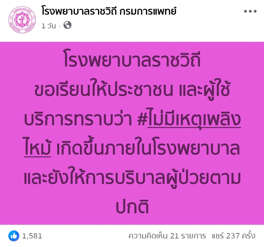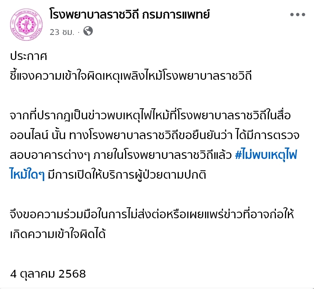 สรุปคือ ข่าวไฟไหม้ ‘รพ.ราชวิถี’ เป็นข่าวลวง! ขอให้ทุกท่านสบายใจได้ ผู้ป่วยทุกคนปลอดภัย โรงพยาบาลยังเปิดให้บริการตามเดิมค่ะ!