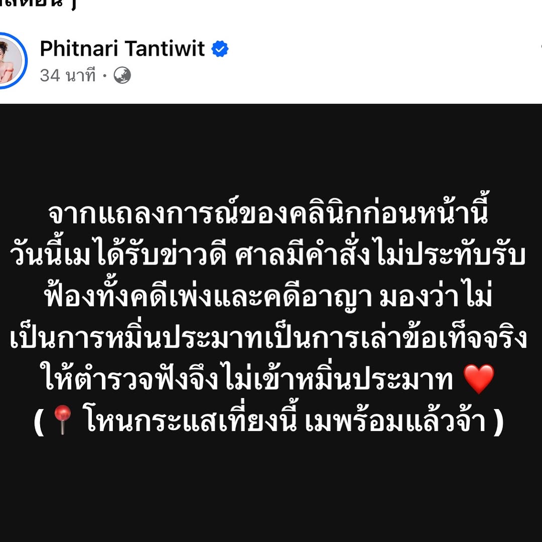 โดยช่วงเช้าวันนี้ เม พรีมายา ได้โพสต์ข้อความแจ้งข่าวดีผ่านช่องทางส่วนตัวว่า ศาลมีคำสั่งไม่ประทับรับฟ้อง ทั้งคดีแพ่งและคดีอาญา ที่ถูกคลินิกคู่กรณีฟ้องร้องในข้อหาหมิ่นประมาท ซึ่งศาลพิจารณาว่า การกระทำดังกล่าว ไม่เข้าข่ายการหมิ่นประมาท เนื่องจากเป็นการ “เล่าข้อเท็จจริงให้ตำรวจฟัง” ซึ่งถือเป็นชัยชนะทางกฎหมายที่สำคัญสำหรับเธอในการสู้คดีเรื่องการถูกฮุบกิจการ