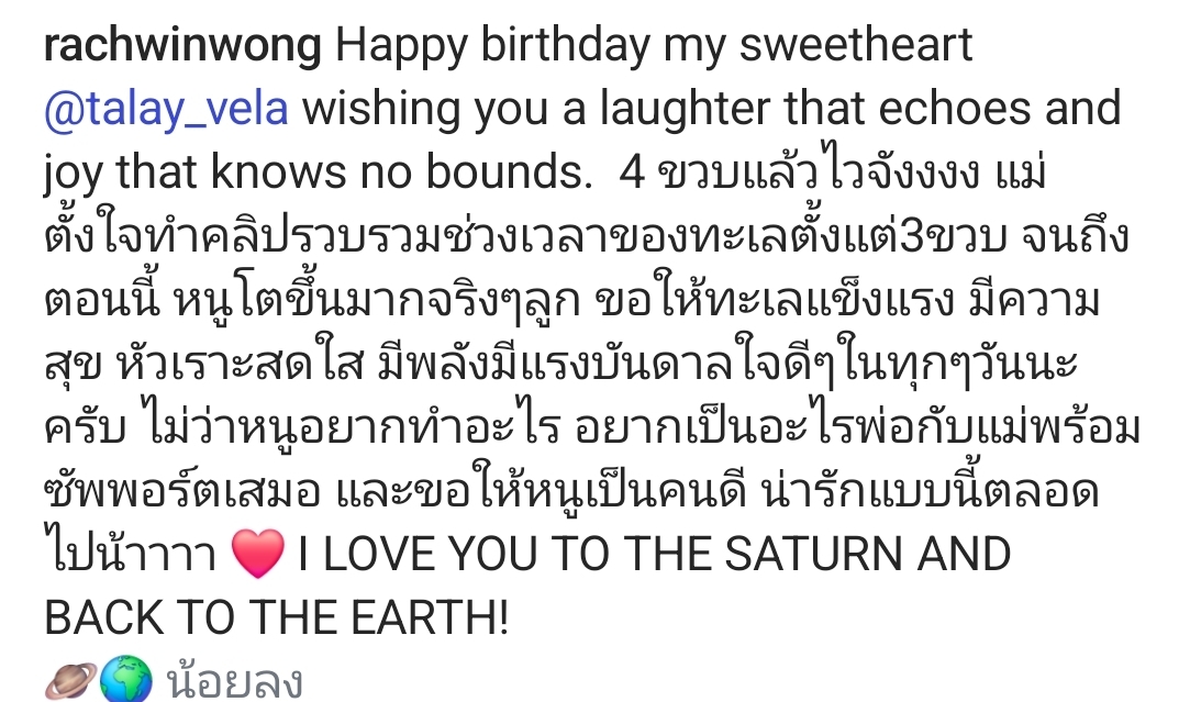 โดยในวันนี้ ก้อย รัชวิน ได้เผยแพร่คลิปรวมความสุขของ น้องทะเล พร้อมแคปชันสุดกินใจที่ทำเอาคนอ่านน้ำตาคลอตาม โดยมีข้อความว่า “Happy birthday my sweetheart @talay_vela wishing you a laughter that echoes and joy that knows no bounds. 4 ขวบแล้วไวจังงงง แม่ตั้งใจทำคลิปรวบรวมช่วงเวลาของทะเลตั้งแต่ 3 ขวบ จนถึงตอนนี้ หนูโตขึ้นมากจริง ๆ ลูก ขอให้ทะเลแข็งแรง มีความสุข หัวเราะสดใส มีพลังมีแรงบันดาลใจดี ๆ ในทุก ๆ วันนะครับ ไม่ว่าหนูอยากทำอะไร อยากเป็นอะไรพ่อกับแม่พร้อมซัพพอร์ตเสมอ และขอให้หนูเป็นคนดี น่ารักแบบนี้ตลอดไปน้าาาา ❤️ I LOVE YOU TO THE SATURN AND BACK TO THE EARTH!”