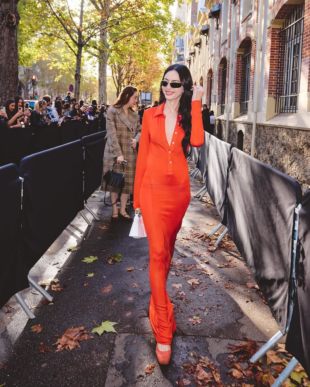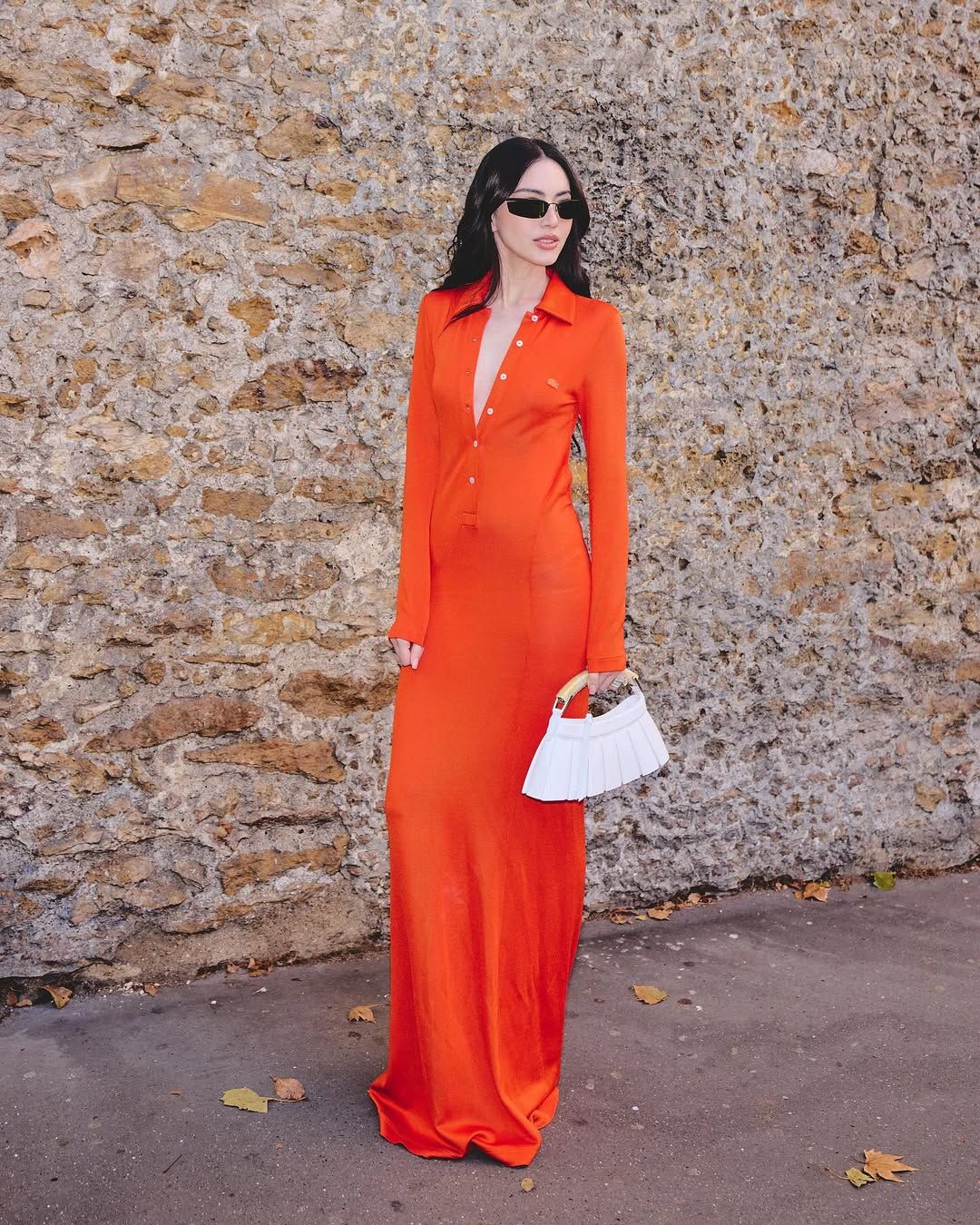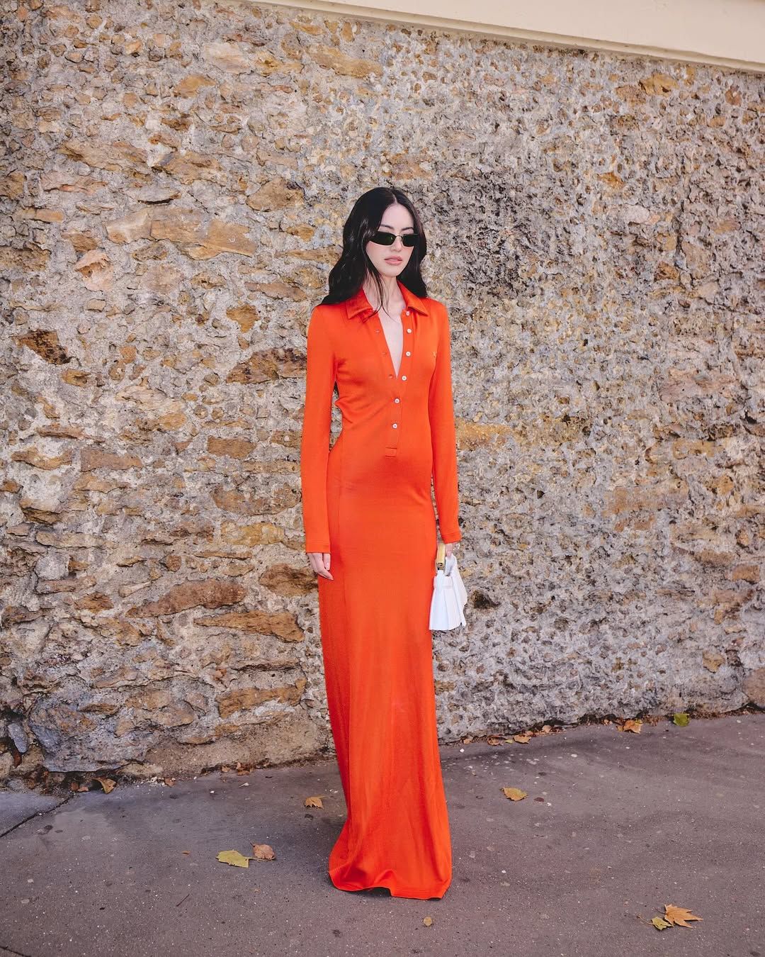 ลุคนี้เป็นลุคที่ลงตัวและทรงพลังสุดๆ! ใหม่ แมตช์ชุดส้มร้อนแรงกับรองเท้าส้นสูงสีส้มอิฐ และถือกระเป๋าสีขาวสุดชิคที่ช่วยเสริมให้ลุคดูสดใสและไม่หนักจนเกินไป แถมยังคอมพลีทลุคด้วยแว่นกันแดดสีดำทรงเพรียว ที่ช่วยเสริมความเท่และลึกลับตามสไตล์ซูเปอร์โมเดล!