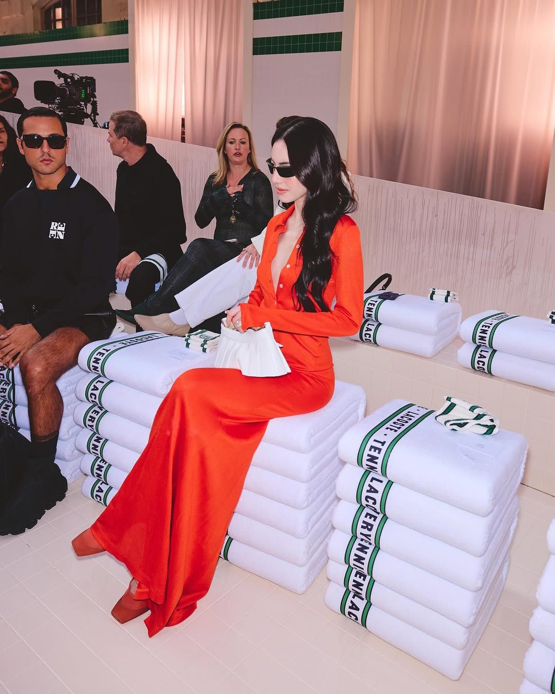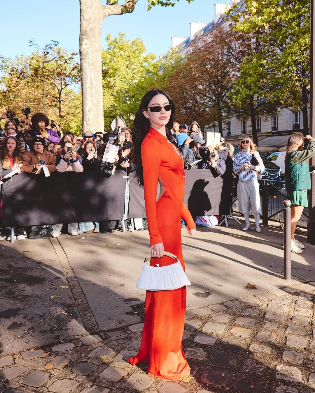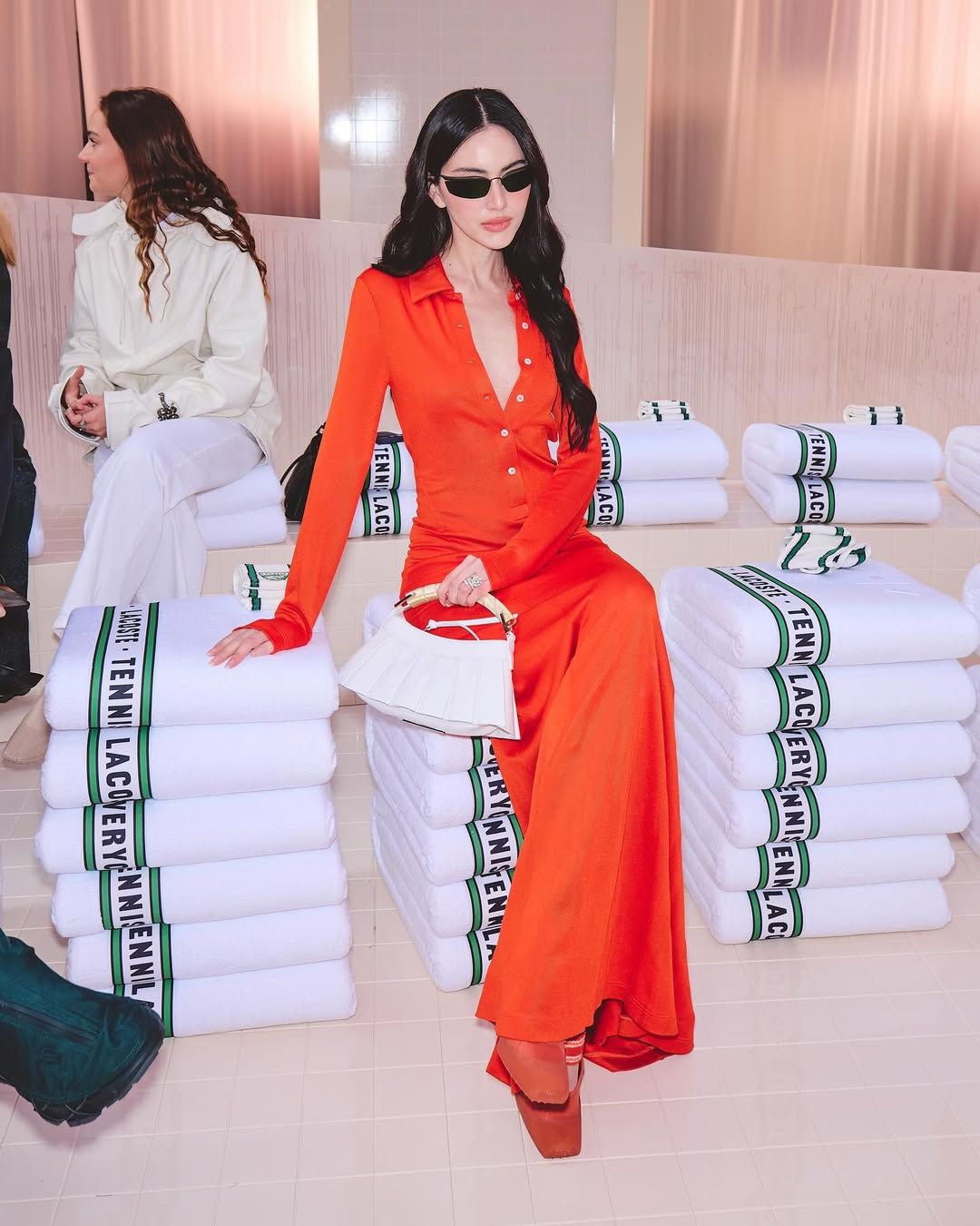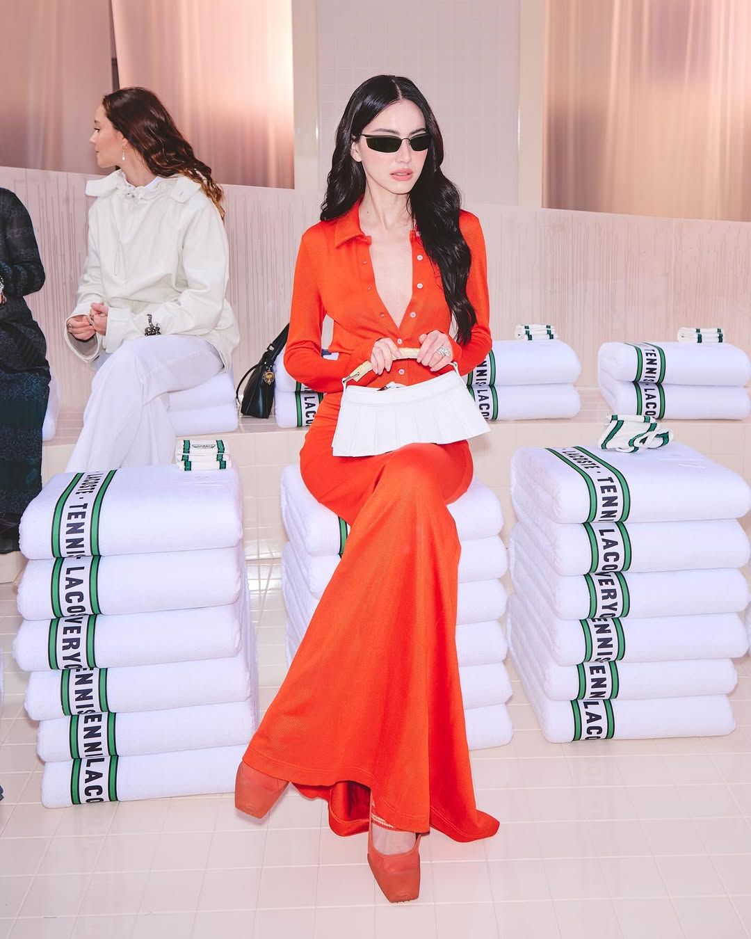 ลุคนี้เป็นลุคที่ลงตัวและทรงพลังสุดๆ! ใหม่ แมตช์ชุดส้มร้อนแรงกับรองเท้าส้นสูงสีส้มอิฐ และถือกระเป๋าสีขาวสุดชิคที่ช่วยเสริมให้ลุคดูสดใสและไม่หนักจนเกินไป แถมยังคอมพลีทลุคด้วยแว่นกันแดดสีดำทรงเพรียว ที่ช่วยเสริมความเท่และลึกลับตามสไตล์ซูเปอร์โมเดล!