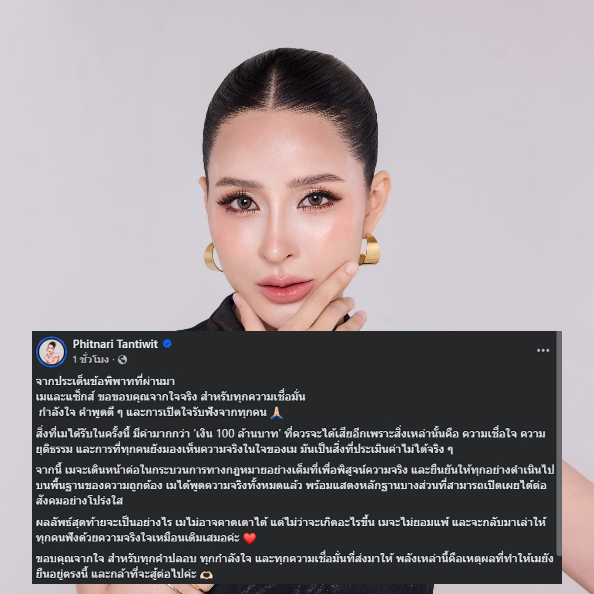 จากประเด็นข้อพิพาทที่ผ่านมา เมและแซ็กส์ ขอขอบคุณจากใจจริง สำหรับทุกความเชื่อมั่น กำลังใจ คำพูดดี ๆ และการเปิดใจรับฟังจากทุกคน 🙏🏻 สิ่งที่เมได้รับในครั้งนี้ มีค่ามากกว่า ‘เงิน 100 ล้านบาท’ ที่ควรจะได้เสียอีกเพราะสิ่งเหล่านั้นคือ ความเชื่อใจ ความยุติธรรม และการที่ทุกคนยังมองเห็นความจริงในใจของเม มันเป็นสิ่งที่ประเมินค่าไม่ได้จริง ๆ