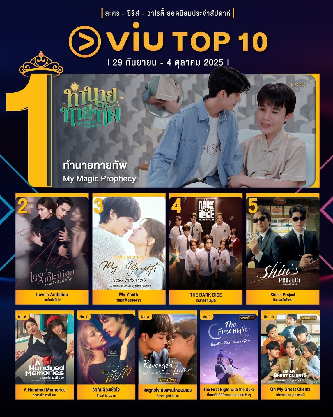 ถึงแม้ซีรีส์จะลาจอไปแล้ว แต่ความอินยังไม่เคยหาย สำหรับ ทำนายทายทัพ My Magic Prophecy ซีรีส์ฟีลกู๊ดที่มาแรงไม่หยุด ล่าสุดยังคงครองอันดับ 1 บน Ranking ของ Viu (วิว) ยาวนานถึง 7 สัปดาห์ สร้างปรากฏการณ์ที่พิสูจน์แล้วว่าเรื่องนี้ “จบแต่ใจไม่จบ” จริง ๆ